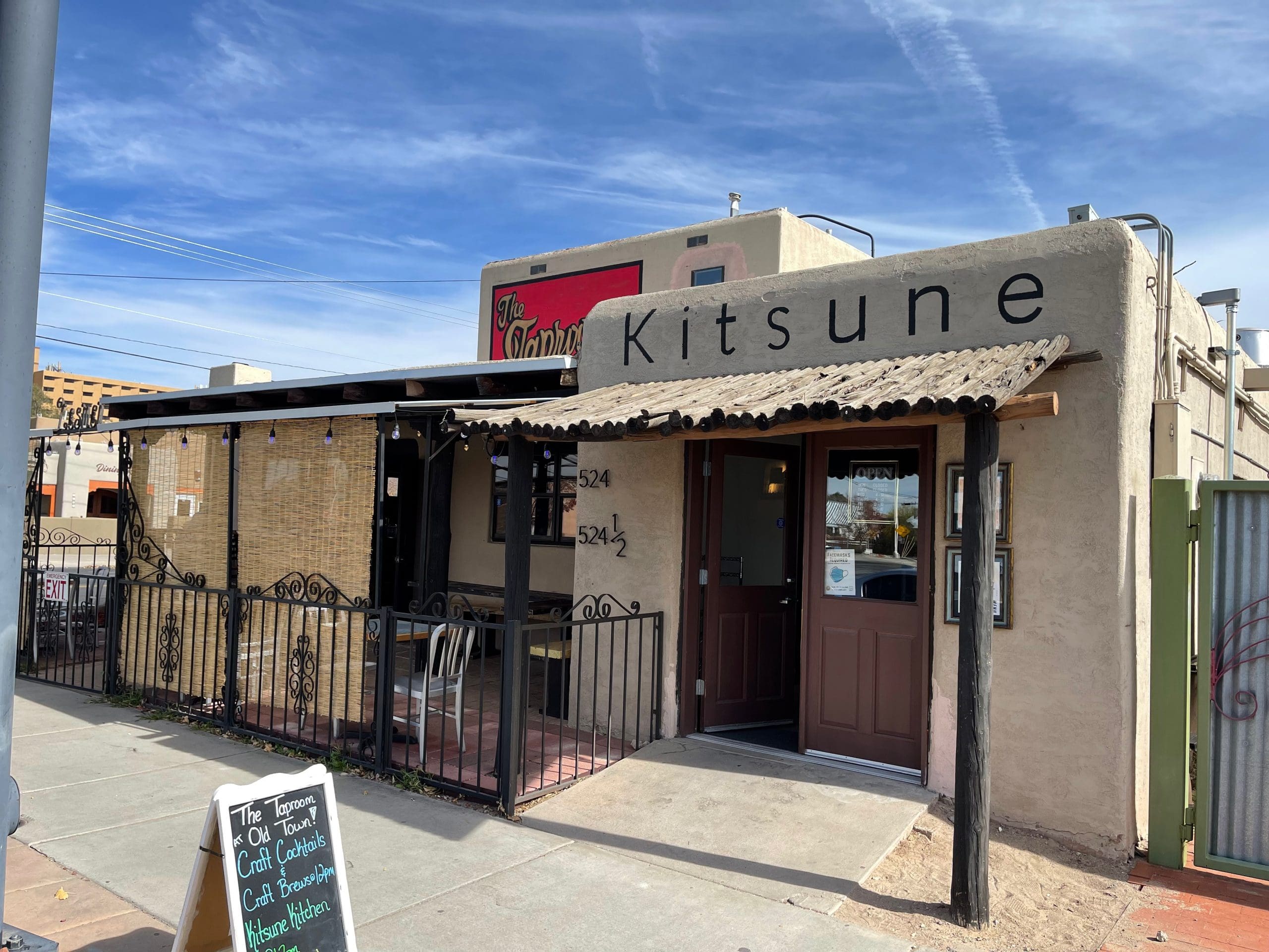 In July, 2021, Kitsune launched a brick-and-mortar restaurant near the Romero Street entrance to Albuquerque’s Old Town. Kitsune sits in a very familiar location–the former home of the controversial Candy Lady where it shares space with the Taproom at Old Town. Prefacing the restaurant’s entrance is a small patio from where you can watch tourists and locals alike vie for a parking spot. There’s a larger patio in back of the rather austere, almost minimalist dining room.