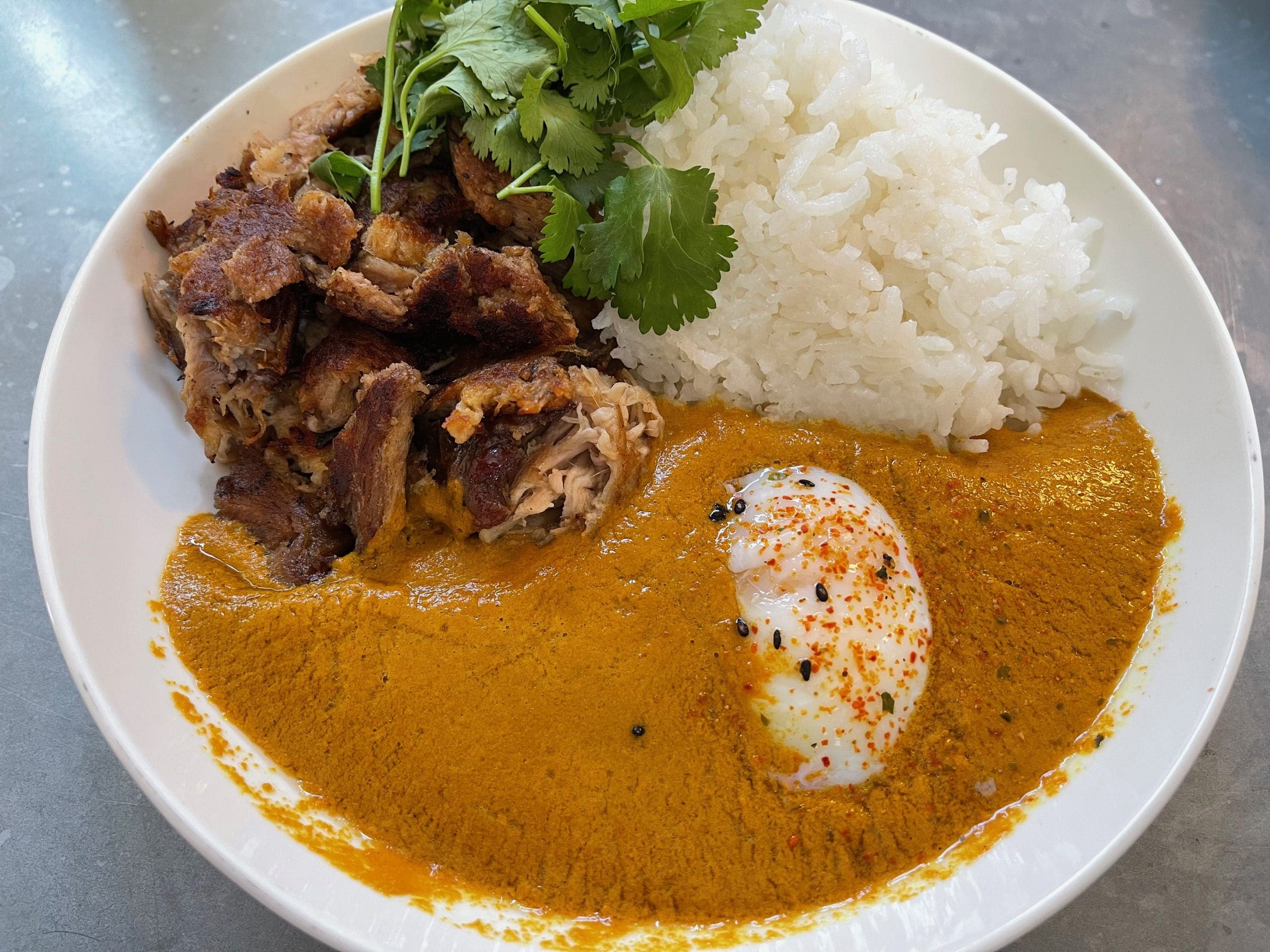 It doesn’t often surprise me to discover the melding of somewhat similar and very complimentary ingredients, but Kitsune’s red chile curry rice bowl (Hatch red chile curry, pulled pork, slow egg, cilantro and lime) blew me away. There’s genius in this dish–sagacity in contriving of a Hatch red chile-based curry, erudition in pairing that curry with a generous portion of pulled pork and sheer brilliance in adding a slow egg to the mix. Each of these components would work well alone, but combining them all is flair, artistry and….genius.