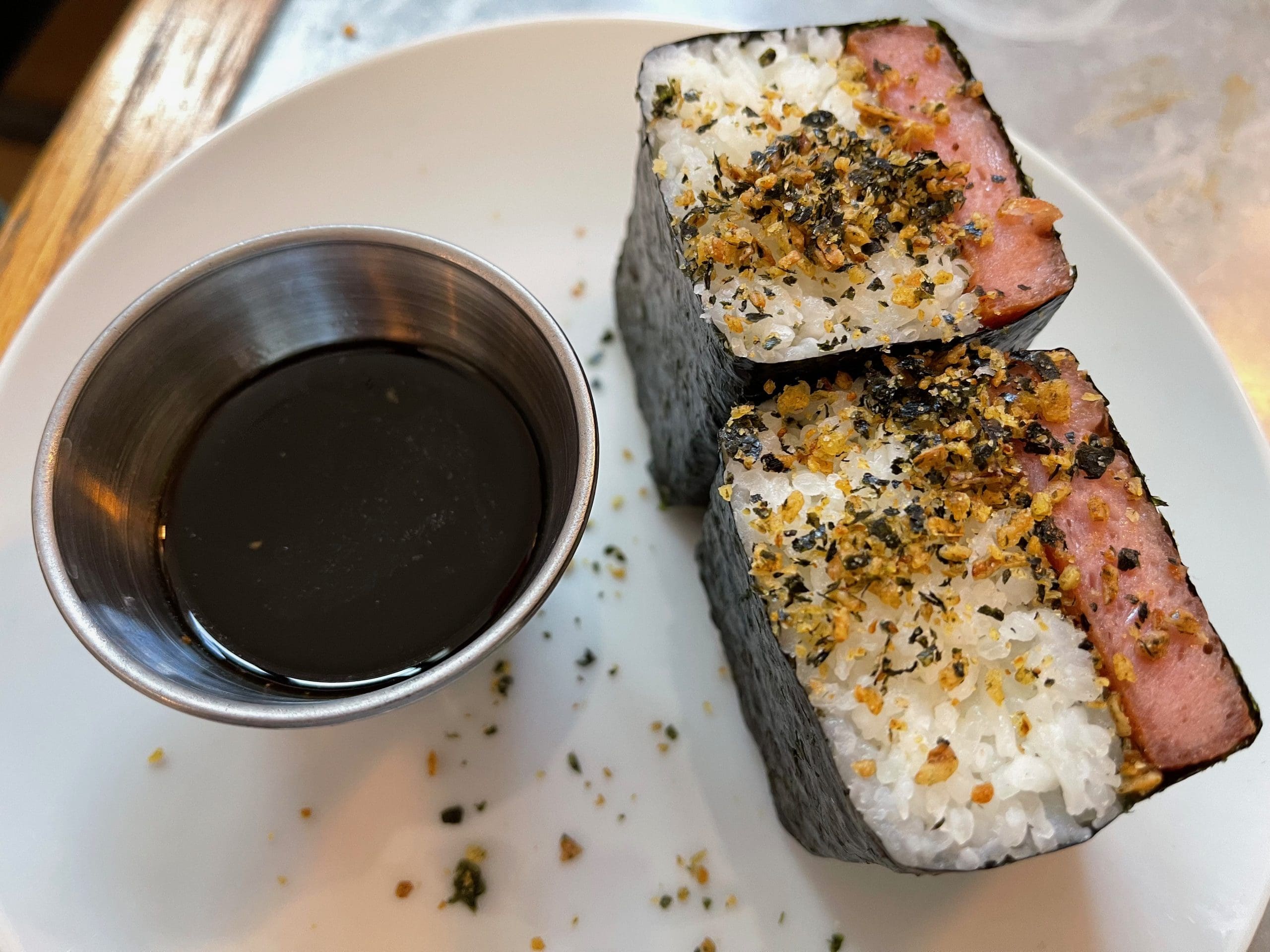 Even Hawaii is represented on Kitsune’s menu. That’s in the form of musubi (sweet and salty glazed Spam on a layer of fluffy white rice wrapped with a roasted nori sheet), the Aloha State’s answer to sushi. It may seem everyone knows about Hawaii’s affection for Spam, but many people haven’t even heard of musubi, another expression of the versatility of a delicious food that is somehow more often thought of as unwanted email.