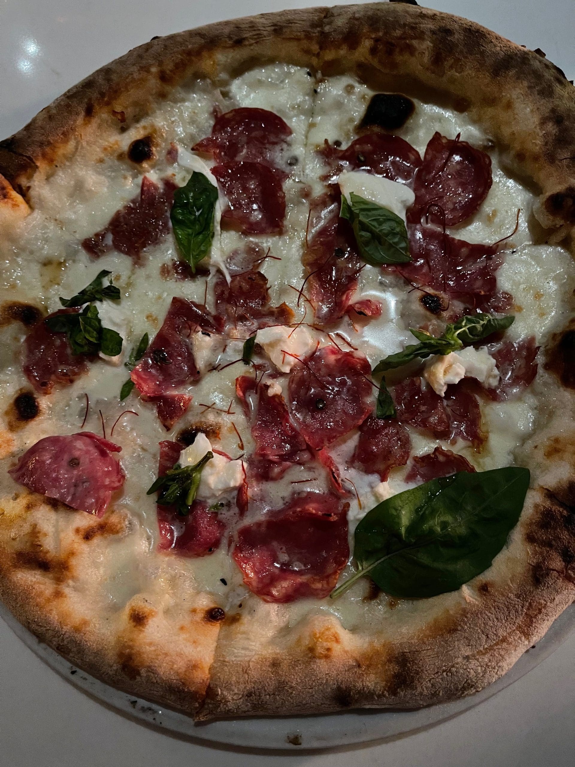 Though the tomato is now ubiquitous in Italian cooking and on pizza, we frequently enjoy pizza sans tomato sauce. It’s not sacrilege when “pizza bianca” is constructed as well as pizzaiolo have learned to do so over the years. Our server recommended the Burratella, a pie topped with hot soppressata, burrata, mozzarella, honey and chili threads. Burratta, “essentially a shell of mozzarella wrapped around a lush mixture of cheese curds and cream all formed into one supple, malleable ball” is my Kim’s favorite cheese and this pie showcased the creamy, milky qualities she loves. Not surprisingly my favorite ingredients were the hot soppressata and the chili threads, neither of which were particularly piquant to this fire-eater. More than any pizza we’ve enjoyed in recent years, the crust had the inimitable aroma and taste of freshly baked bread, so good my Kim didn’t even mind the char.