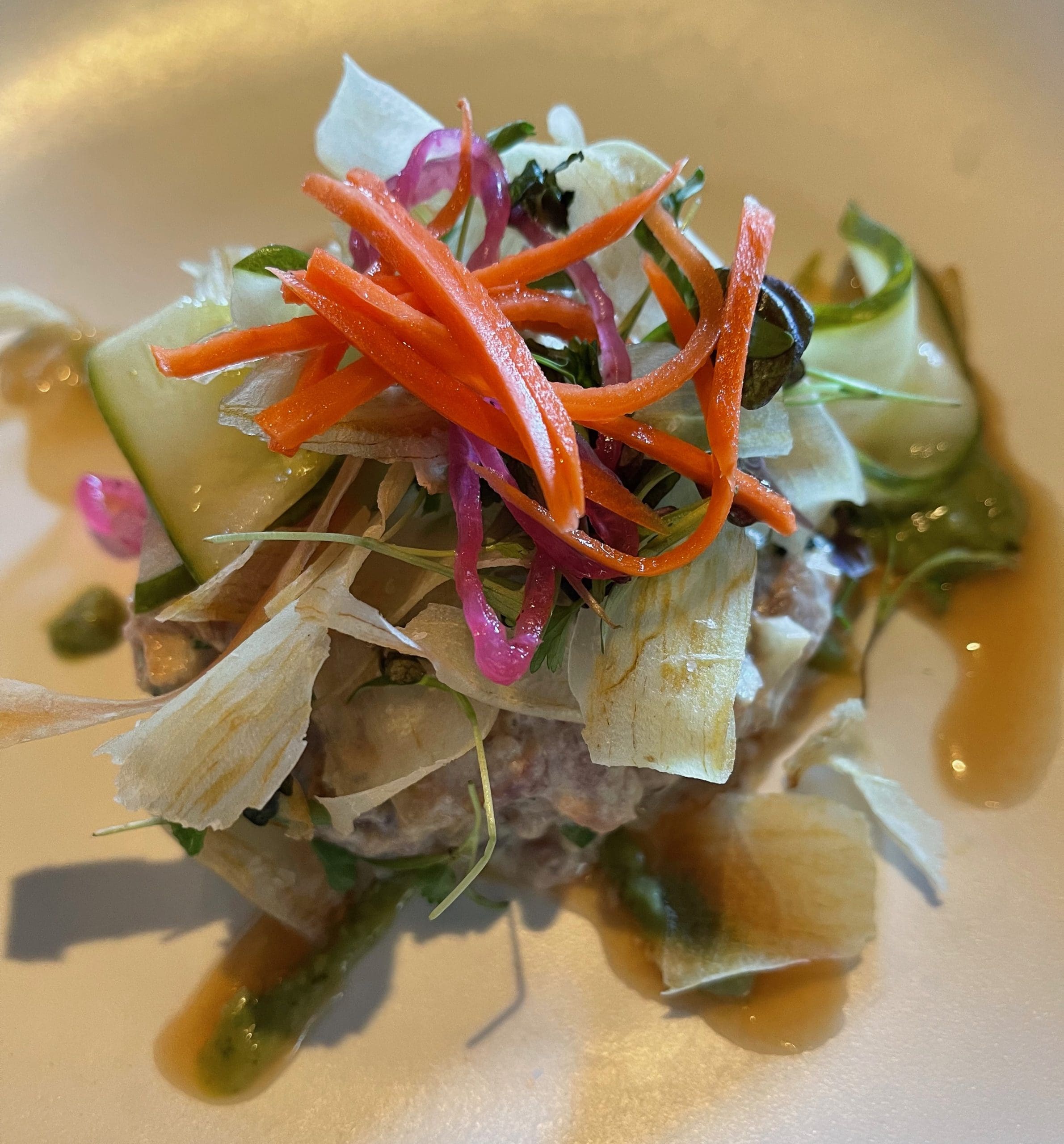 3 January 2022: The unnamed smaller menu listed only four items including a 16-ounce grilled rib eye, a charcuterie board, crushed whipped potatoes and tuna ceviche (diced ahi tuna, jicama, jalapeno, coconut soy vinaigrette, micro shisho). Acid from a citrus marinade acts as a catalyst that both alters the texture of the ahi and “cooks” it. This ceviche is light, fresh, herbaceous, and has a nice balance between citrusy and ever so slightly sweet (from the coconut soy). The dried jicama “chips” provided a textural change of pace.