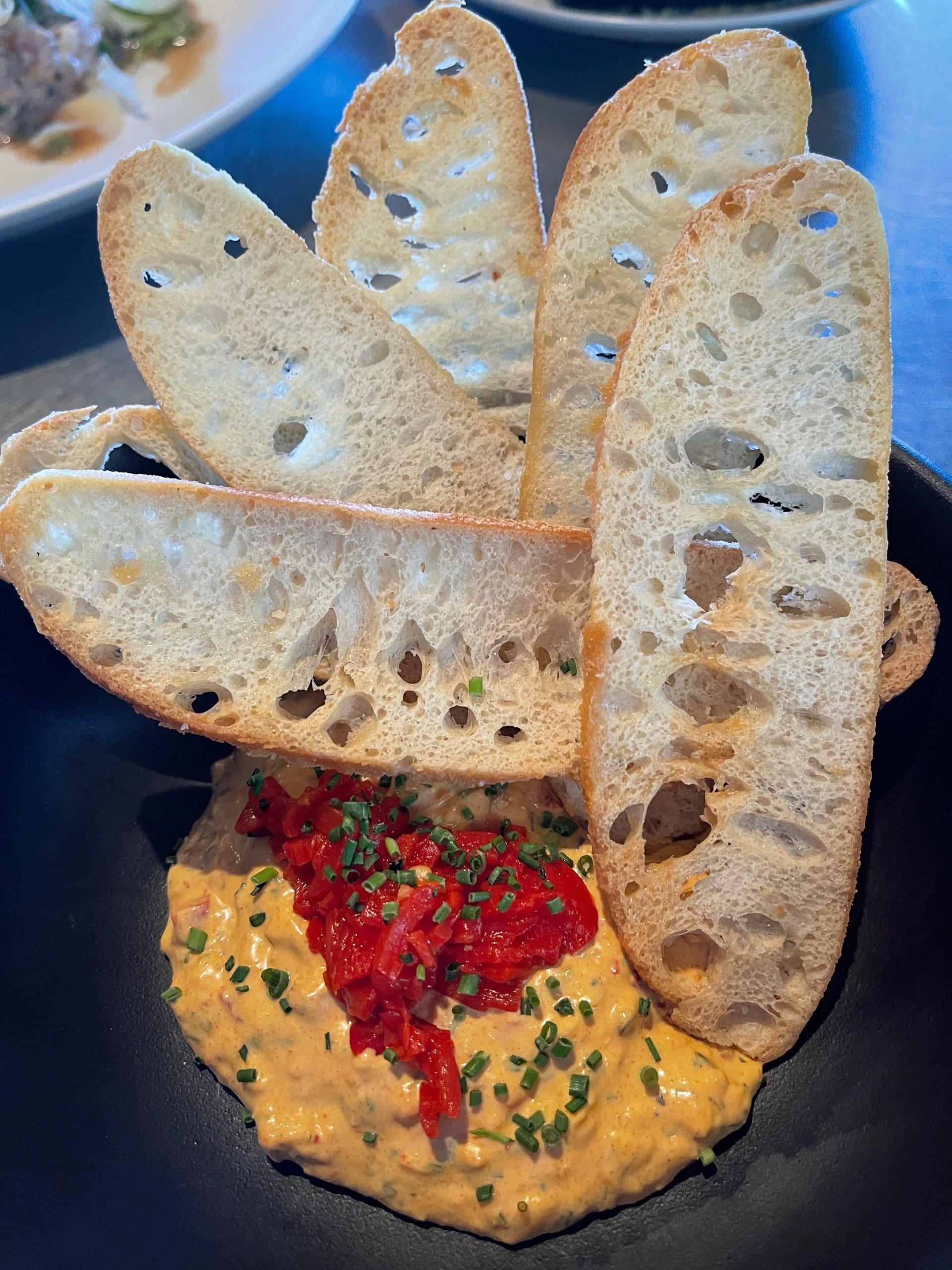 3 January 2022: Pimento cheese is ubiquitous throughout the South, but nowhere more than in South Carolina, the Pimento State where it’s respectfully and lovingly referred to as “Southern Paté” or the “Caviar of the South.” Author Reynolds Price, a North Carolina resident even dubbed it “the peanut butter of my childhood.” It’s one of the foods we’ve missed most since leaving Mississippi in 1995. Only a handful of restaurants in New Mexico have offered it so when Whiptail’s menu listed Pimento Cheese (Chimayo red chile, red peppers, white Cheddar, cream cheese, toasted herb crostini), we jumped on it.