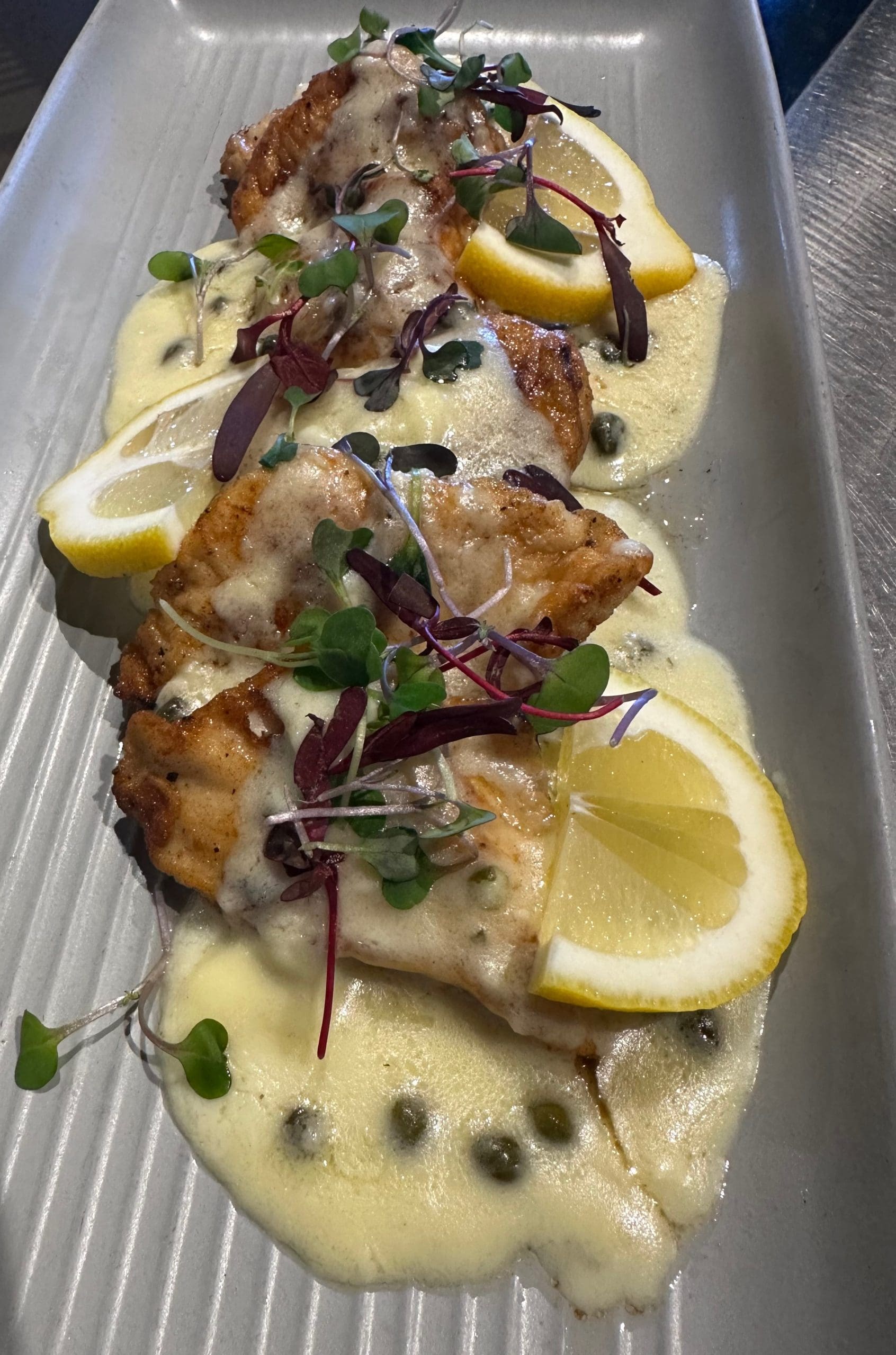 14 March 2024: The Shareable Large Plates menu includes a number of Italian favorites such as fruitti del mar and chicken piccata (pan-fried chicken cutlets, lemon cream sauce, capers, lemon slices). Though my preference is always veal, its chicken counterpart is quite good. The piccata sauce is wonderfully lemony without pursing your lips. It’s got a nice fatty texture courtesy of the fat (or maybe butter) in which it’s prepared. Capers provide floral notes, a lemony tang and salty flavor profile with a brininess reminiscent of green olives.