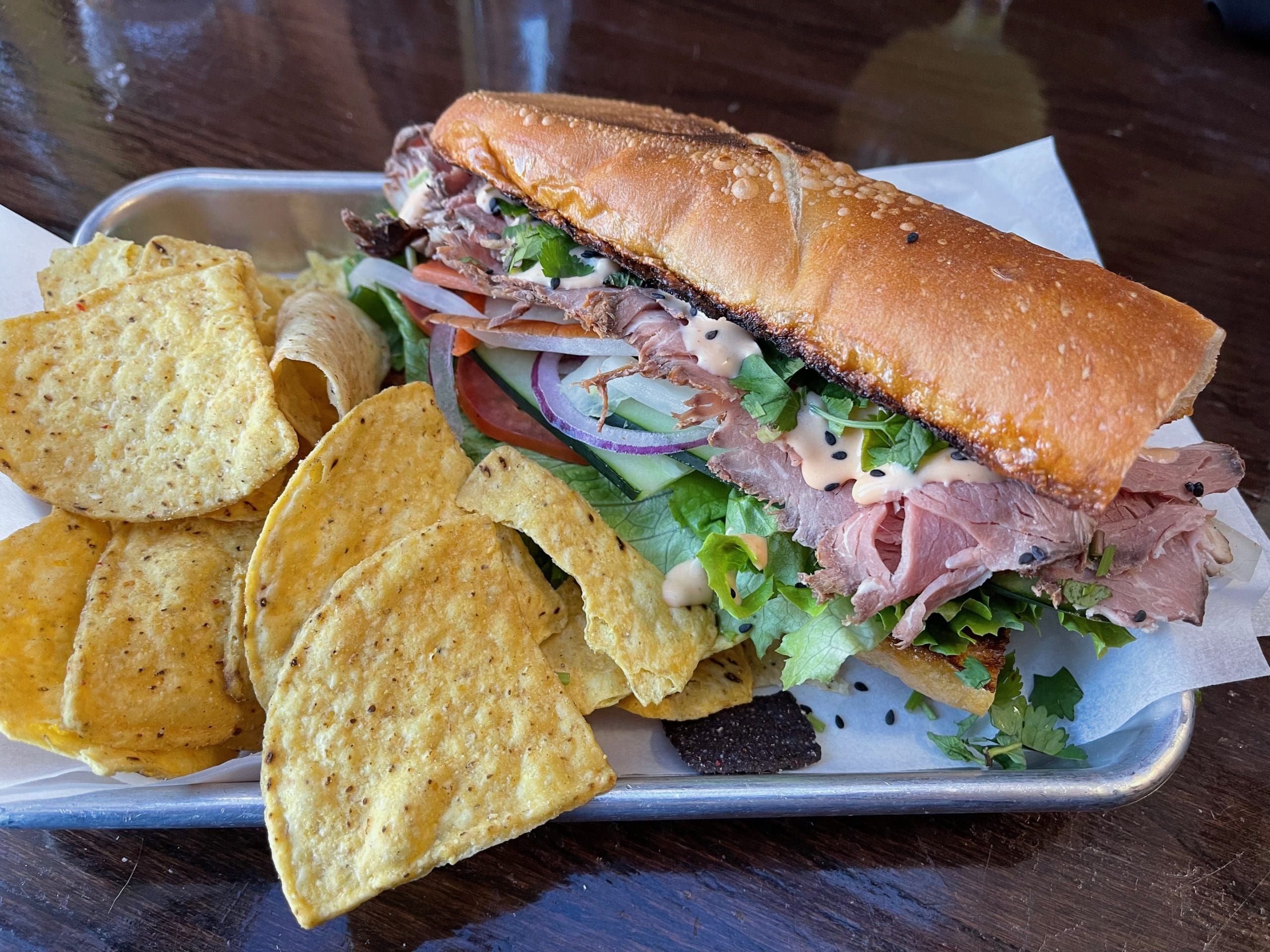 14 January 2022: Not every item will be a complete copy of the same item at a more traditional Vietnamese restaurants, but the differences are definitely exciting. Take the banh mi, for example. Nestled in a fresh baked 6-inch toasted French bread hoagie, you’ll find “crisp green leaf lettuce, succulent cucumber, plump Roma tomatoes, fresh Thai basil, mint, cilantro, red onions, green chile kimchi, Sriracha aioli and black sesame seeds” along with your choice of protein: bulgogi beef, applewood smoked prime rib, sauteed hand-crafted tofu, sauteed shrimp or baked Scottish salmon. It’s a veritable smorgasbord of vegetables, sauces and protein. Our choice was the applewood smoked prime rib, thinly shaved slices of pure meat candy. As with all outstanding banh mi, this sandwich offers a balance of flavors–savory, tangy, smoky and sweet. It’s probably twice the cost of most banh mi in Albuquerque, but it’s worth the splurge.