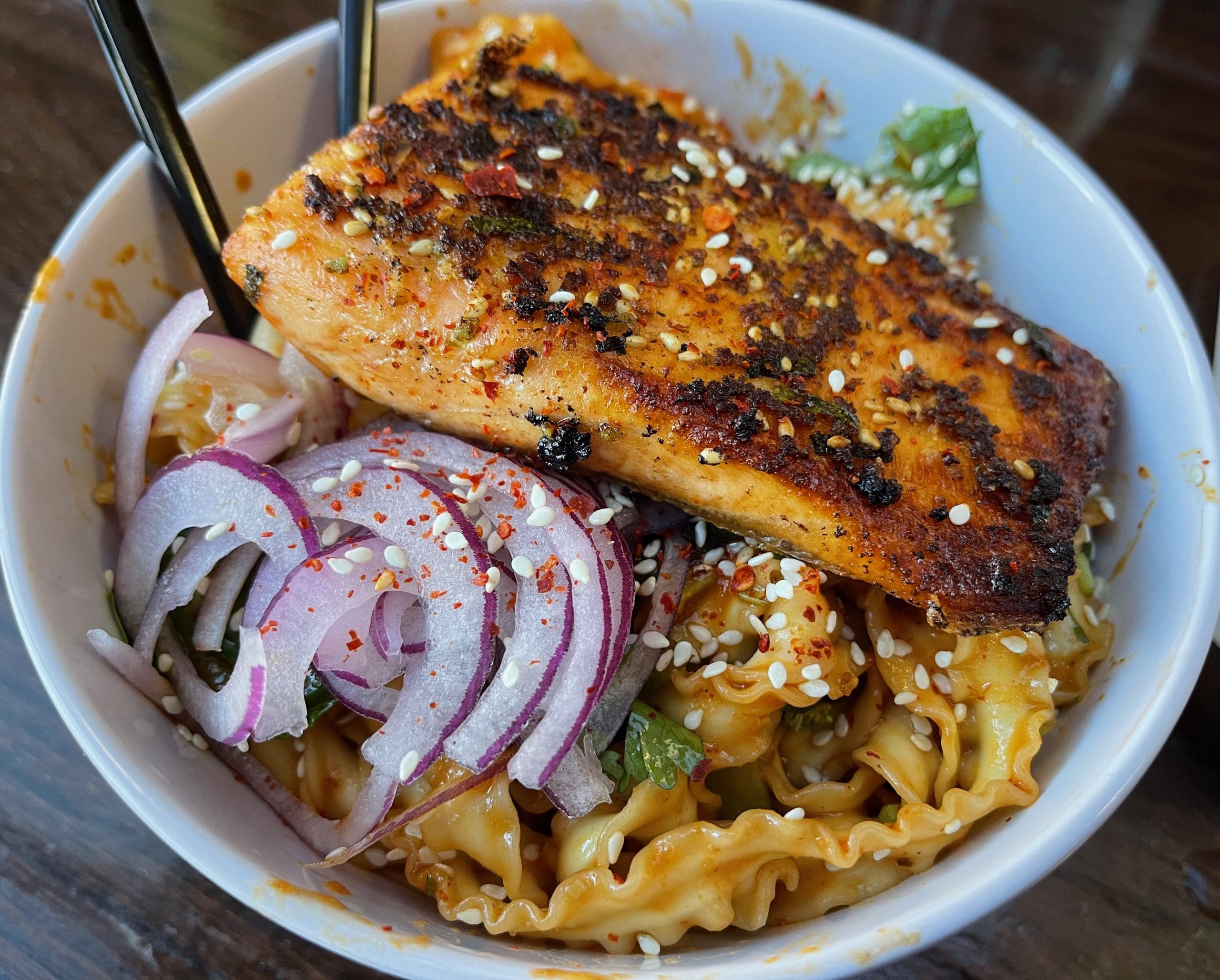 14 January 2022: Wow! That’s the very first adjective that comes to mind to describe the Szechuan Noodles(sliced noodles invigorated with an incendiary homemade spicy Szechuan sauce along with shiitake mushrooms, red onions, Chinese baby broccoli topped with the house mix of cilantro and mint and black sesame seeds). The Szechuan sauce is dynamite, an incendiary treasure that enlivens everything on the plate. This is a dish for fire-eaters, those of us who believe pain is a flavor. The sliced noodles are ridged somewhat like lasagna noodles though much thinner. They’re very slurp-worthy. Every vegetable on the dish is perfectly prepared to a crispy, fresh al dente texture. Though other proteins are available, the Scottish salmon proved a wonderful foil to the fiery noodle dish. Wow! Wow! Wow!
