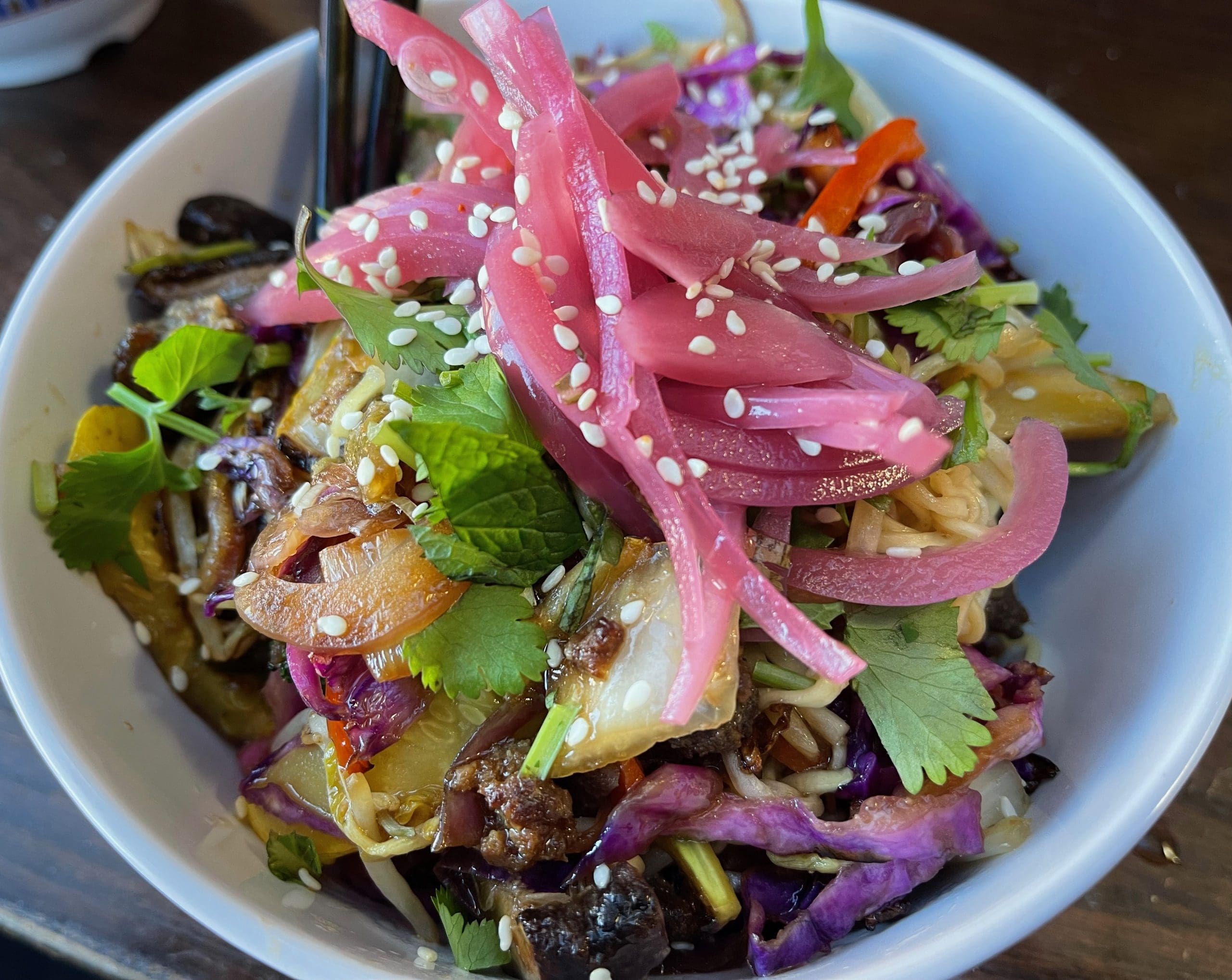 14 January 2022: For my Kim, the Street Cup Noodledish (Shanghai eggplant, Chinese baby broccoli, shiitake mushrooms, yellow squash, bean sprouts, green chile kimchi, pickled red onion, black sesame seeds and the house cilantro-mint mix with her choice of protein) was equally enchanting without the heat she can’t handle. It’s akin to feng shui on a plate, the arrangement of ingredients and colors seemingly designed to make your mouth water. As with the Szechuan noodle dish, every vegetable was as good as it could be and each long, thin noodle strand as satisfying as when you first learned how much fun slurping up noodles could be. The bulgogi wasn’t overly sweet as Americanized “Korean barbecue” sometimes tends to be. My Kim might not take to the streets for a noodle dish this good, but she’d happily send me.
