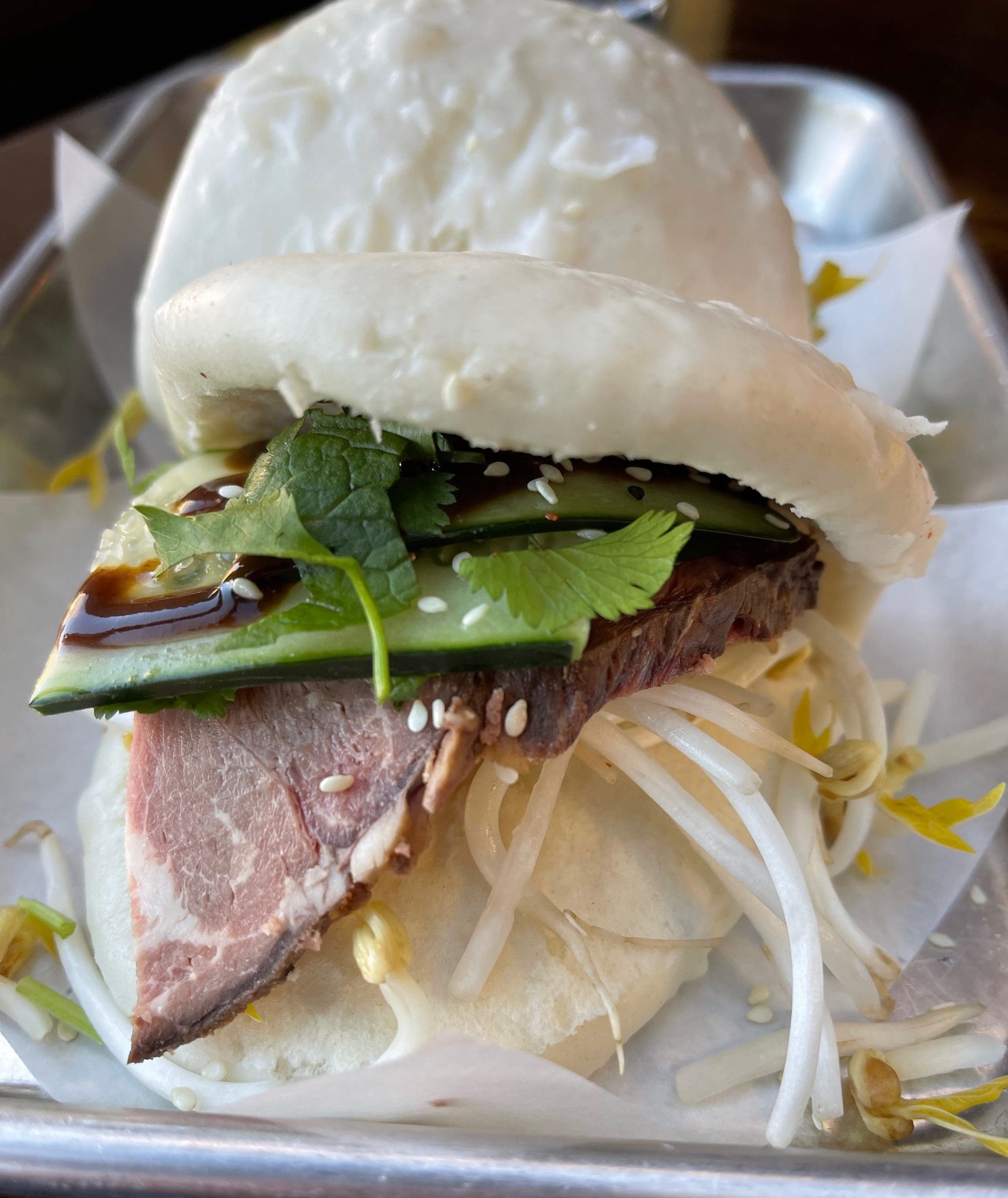 “Over one month back I contacted the owner of this food truck, Nam, wondering how to find him. He was parked outside of Ex Novo Brewery in Corrales and business was “worse than slow”, so he offered to make a house call — while you should not anticipate a similar offer, you need to know about Nam’s character, he’s wonderful. And his food… it’s Vietnamese Foodie/Fried/Fresh/Fire Fusion. Peep the photo of my Bánh Mì Burger with Garlic Aioli, it was loaded, beef perfectly pink, more than a handful. Ditto with the BBQ Pork Steamed Buns, a fantastic dinner that fed two people. If you’re in the presence of this food truck, get ready for an adventure.”