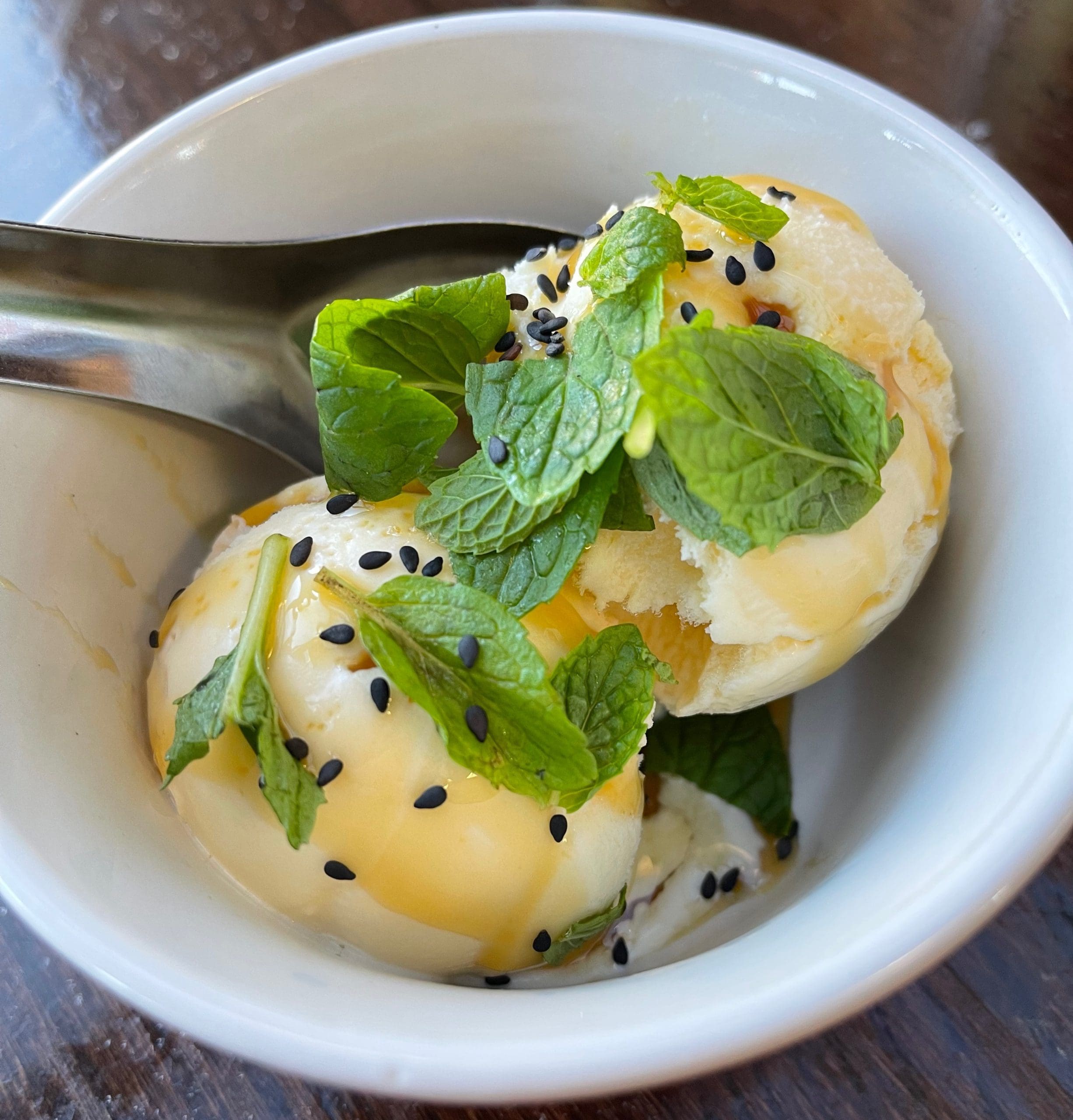 14 January 2022: There were no desserts on the menu though Taylor indicated he and Tram are working on a warm dessert and a cold dessert. After our inaugural visit, Taylor must have thought we didn’t eat enough because he brought us both a dish of vanilla ice cream drizzled with caramel and topped with black sesame seeds and mint. We’ve had mint chocolate chip ice cream dozens of times, but Cafe Nom Nom’s creation blows them out of the water. Cut up sprigs of mint and black sesame seeds provide a wonderful contrast to the sweet ice cream and caramel.