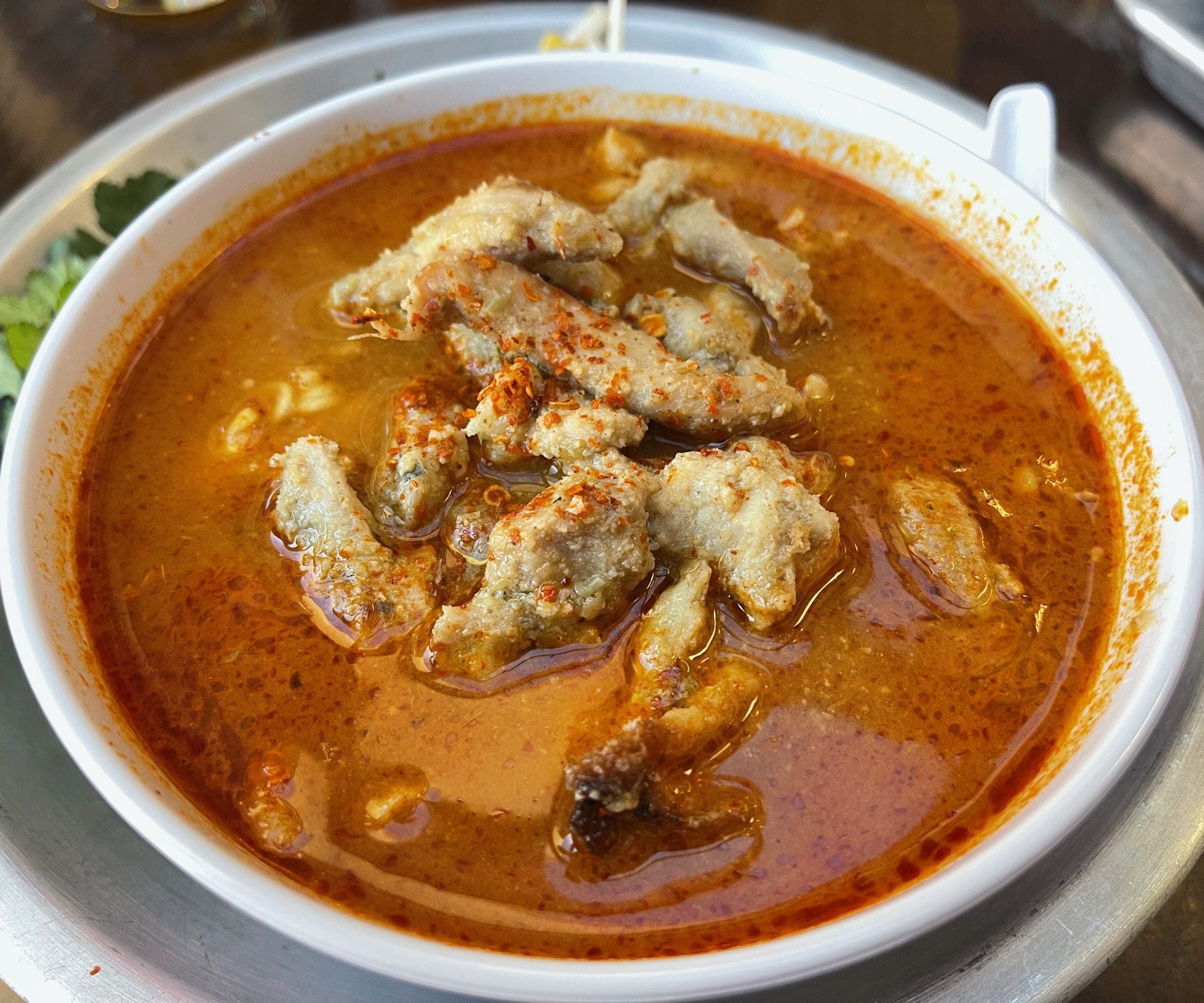 The feature included a quote from renowned raconteur, social activist and television legend Anthony Bourdain: “Anytime I’m eating spicy noodles in a bowl I’m happy.” You’ve got to love The Underbelly’s formulaic approach to storytelling–quotes, history, background. I may have to try that. What YOU have to try, especially if you, too, love spicy noodles in a bowl is Cafe Nom Nom’s red Thai curry and coconut milk ramen with lemongrass chicken. It was the special of the week during our March, 2022 visit. Chef Taylor told us weekly specials are introduced on Wednesday and sometimes sell out by Friday. I got the last one.