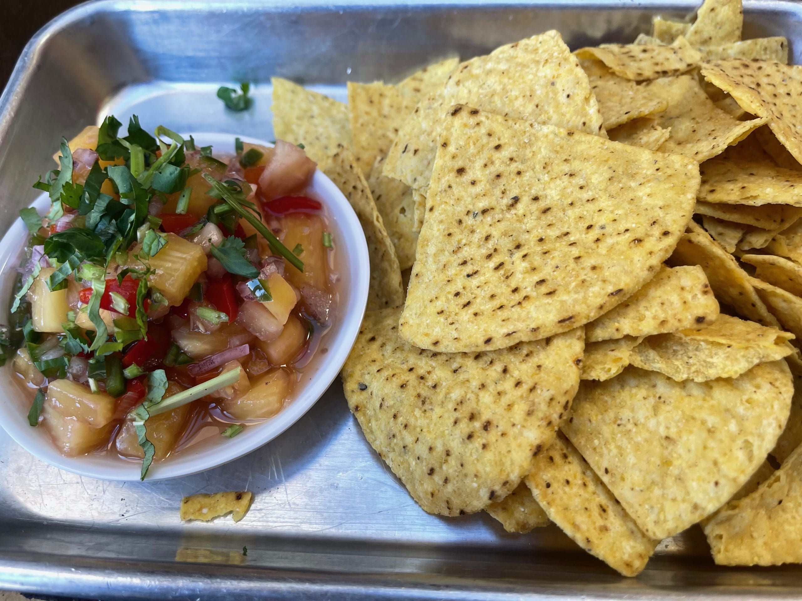 4 March 2022: One of the weekly specials that sold out before our Friday visit was the Hawaiian 5oh5 pork burger with a spicy pineapple chutney. Because my Kim was heartbroken over not being able to enjoy what potentially could become a favorite, Chef Taylor (ever the gentleman) brought us a generous portion of that spicy pineapple chutney and chips. There’s deliciousness in the simplicity of a minimalist chutney made from no more than four or five ingredients (red pepper, red onion, cilantro, jalapeño, pineapple). It’s not especially piquant, but boy is it addictive. Cafe Nom Nom should bottle and sell this chutney.