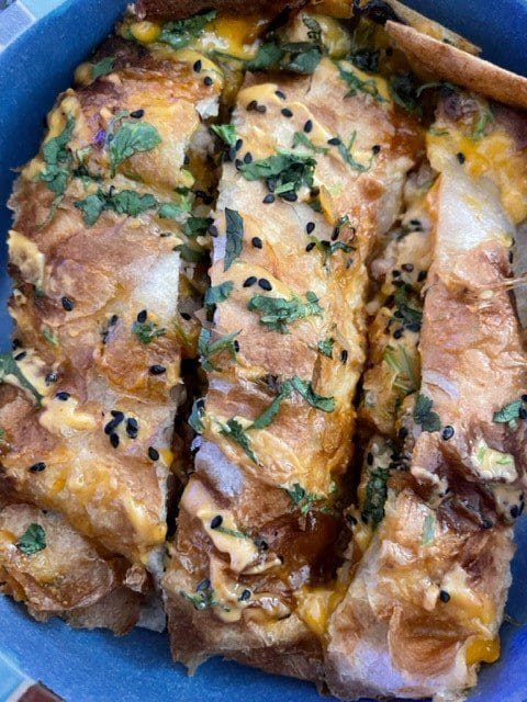 21 January 2022: Vietnam meets New Mexico in Cafe Nom Nom’s Saigon Street quesadilla (a giant 14-inch tortilla filled with hot melted Cheddar cheese, Hatch green chile kimchi, red onions, fresh jalapeños, bean sprouts, Sriracha and hoisin, baked to a crisp and fluffy perfection, topped with housemade Sriracha aioli and sprinkled with a cilantro/mint mix and black sesame seeds). The fusion of two diverse culinary cultures just works. The Saigon Street quesadilla is a revelation! It’s about the size of half a pizza and just explodes with flavors as well as personality–especially with the right protein (such as the lemongrass chicken). There’s plenty of heat in this behemoth, but even more deliciousness.