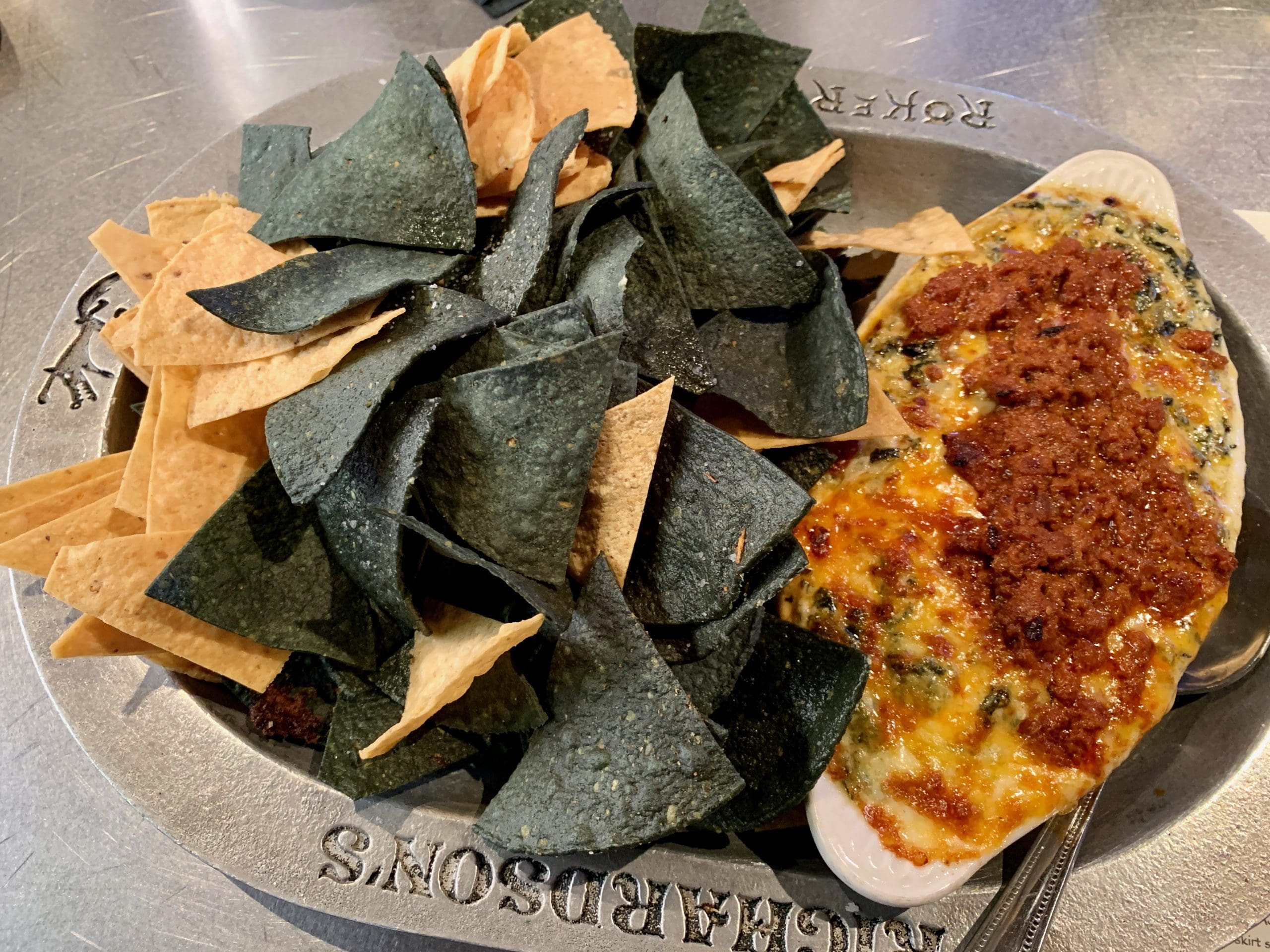 26 December 2020: But I digress. We started our meal with the New Mexico Queso (chorizo, spinach served with house tortilla chips). For the first time in memory, we still had a pile of chips and half the queso remaining when our entrees arrived. Usually we’ve wiped out the paltry amount of queso served us. Lesson learned for New Mexico’s New Mexican restaurants–be more generous with your queso. Also, be more inventive. The chorizo and onions were a wonderful addition, much like Mexico’s queso fundido, but maybe even better.