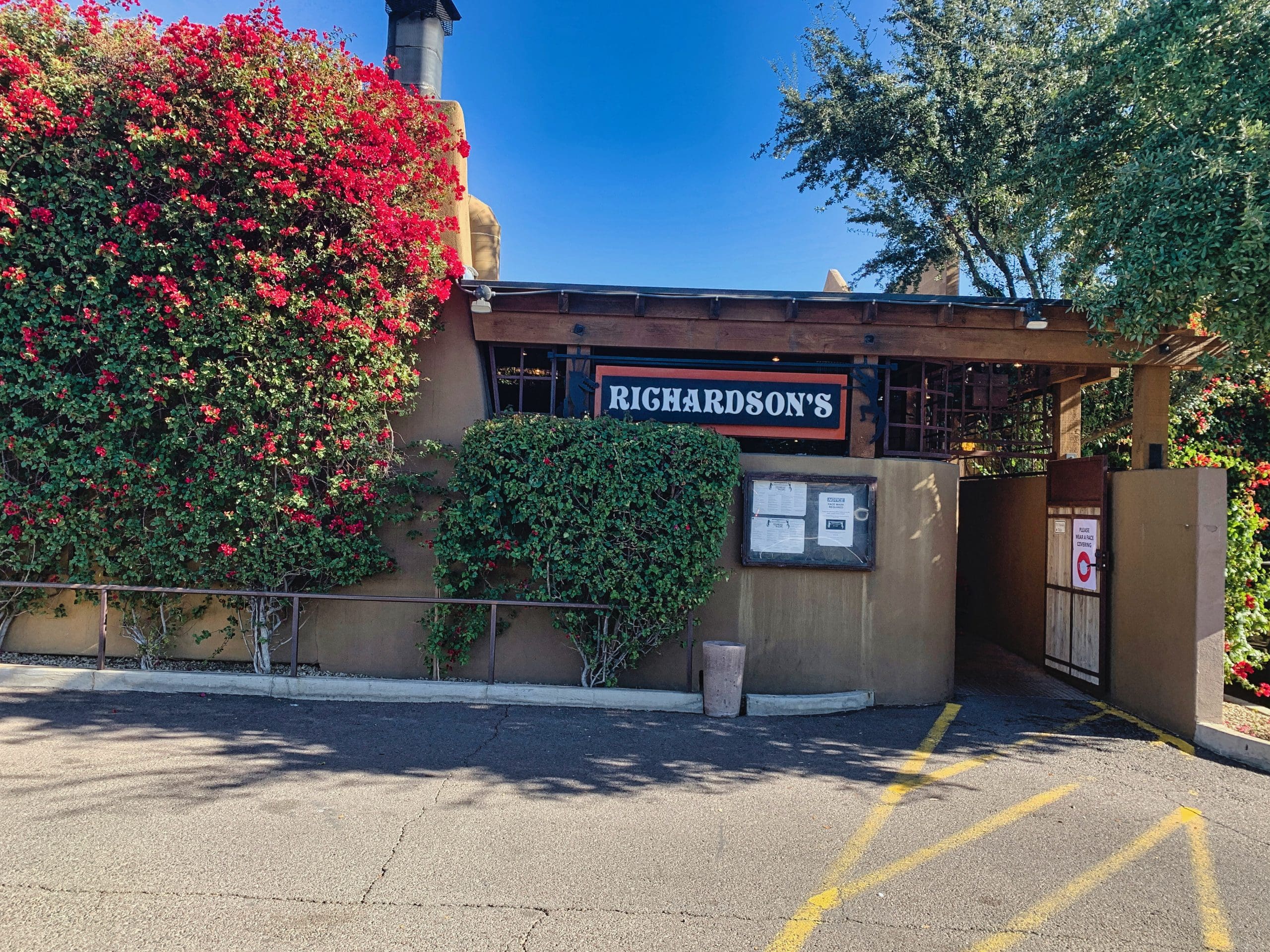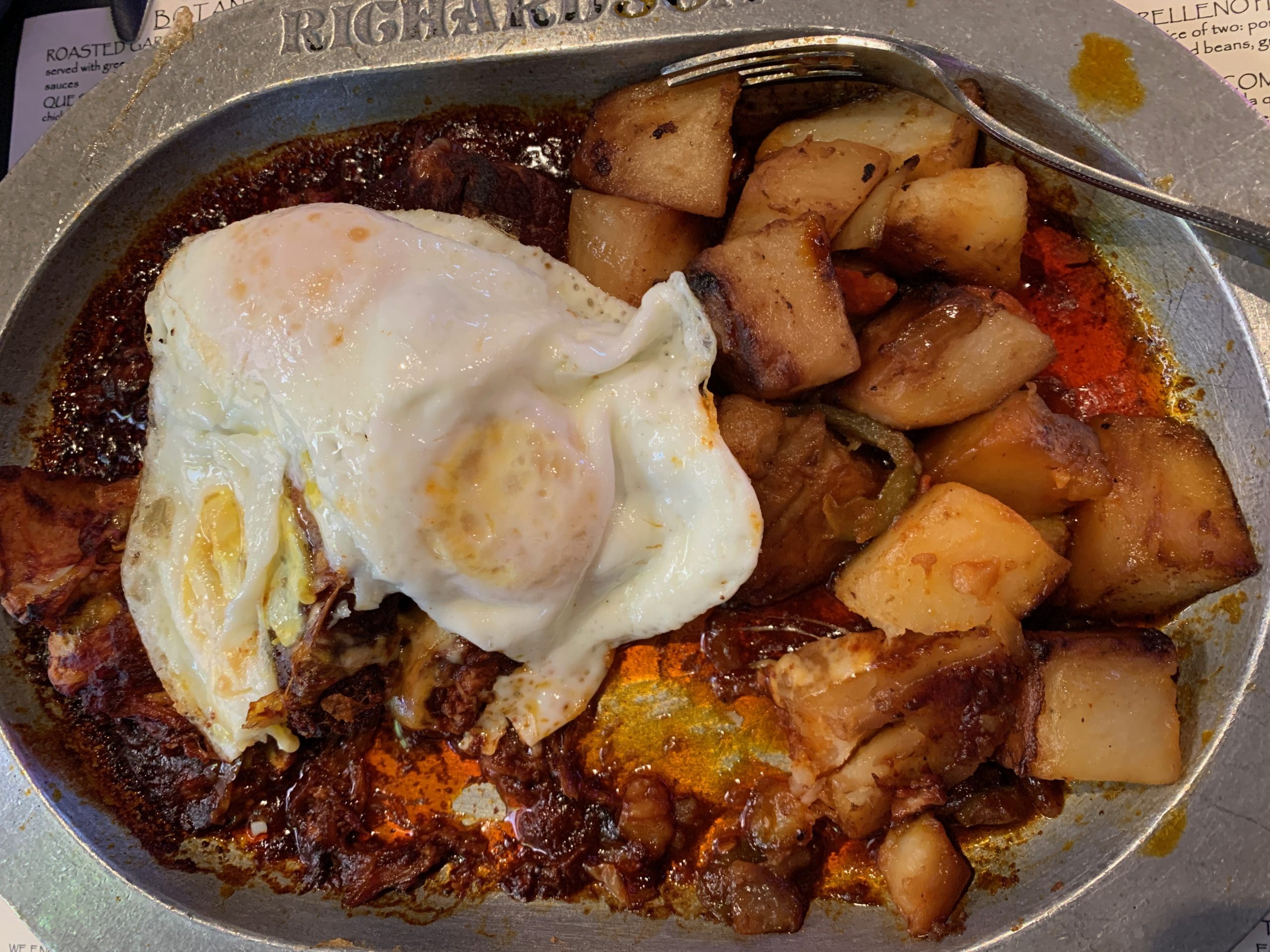 26 December 2020: After being told how transplanted New Mexicans consider Richardson’s cuisine equal to the foods prepared and served within the Land of Enchantment’s sacred borders, we asked where the chile is procured. Our server told us the chile comes from Ahwatukee. “Do you, by chance, mean “Albuquerque,” my Kim asked. “Oh yeah, that’s it. Albuquerque.” It would have been pointless to debate the chile’s true origin when we could instead be enjoying it. My Kim’s carne adovada and eggs proved very enjoyable even though the carne was in the form of chunks, large but tender and smoky chunks of porcine perfection bathed in a burgundy colored chile from Albuquerque. The carne adovada was served with roasted papas and a tortilla so thin, there’s no way it could be used to scoop up any carne adovada. Still, for my adovada adoring bride, Richardson’s carne adovada was worth the trip.
