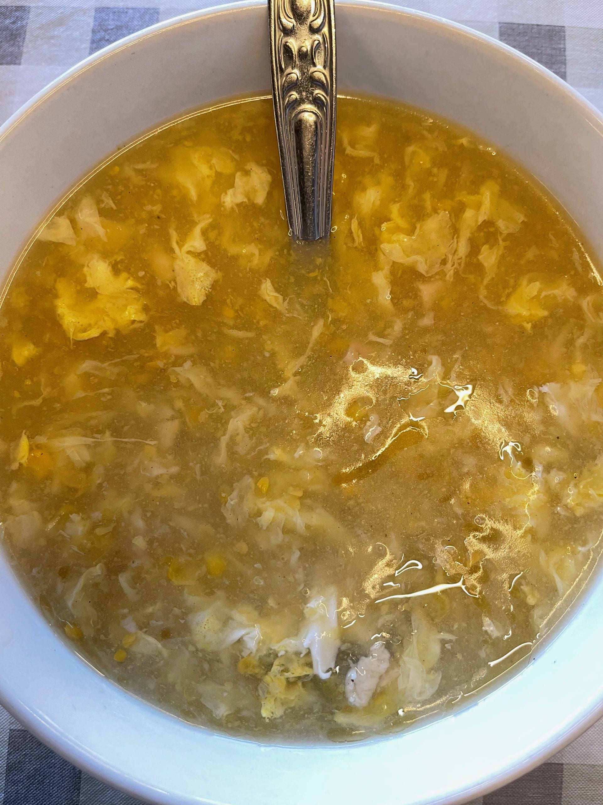 13 March 2022: Our server did his best to try convincing us to order the hot and sour soup, but my elotes enamored bride wanted the chicken creamy corn soup. We expected a smallish bowl of soup as most Chinese restaurants serve. Instead, a swimming pool-sized bowl of opaque amber elixir was delivered delivered to our table. It wasn’t quite as replete with the named ingredients as we would have liked, but with a little doctoring the following day, it was much better. Yeah, you shouldn’t ever have to doctor any restaurant offering, but we tend to do it quite bit courtesy of the Dr. Jekyll in me.