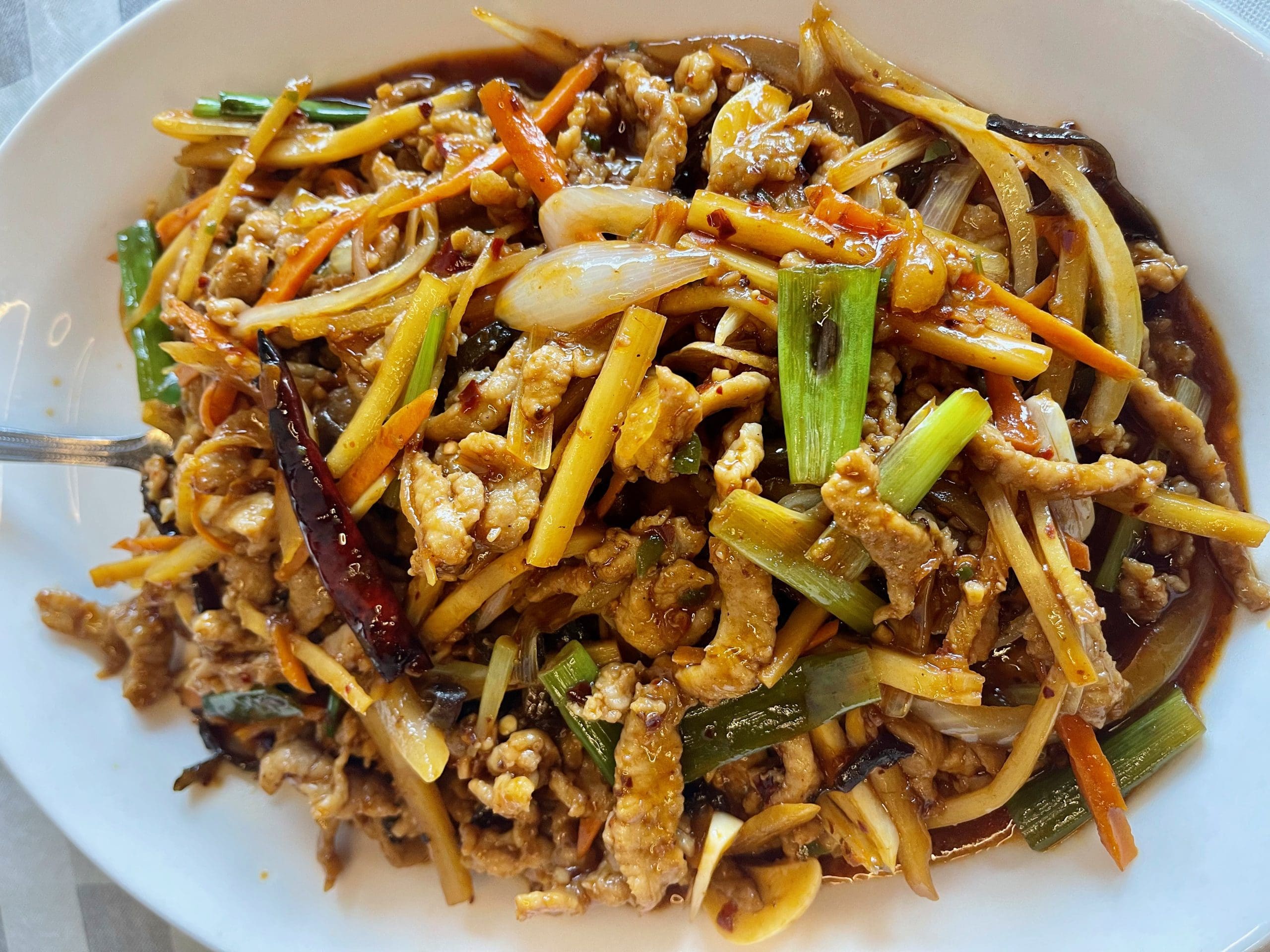 22 July 2022: One of the most frequently ordered delicacies in Szechuan restaurants is shredded pork (Szechuan-style; doesn’t that seem redundant?). What makes it Szechuan style is the generous amount of Szechuan pickled chile (very similar to Thai bird peppers), garlic, ginger, spring onions, shredded carrots and more (maybe wood-ear mushrooms). The complex flavors of this classic Szechuan stir-fry dish has everything you could possibly want: silky tender pork, soft yet crunchy veggies, and an amazingly complex garlicky, piquant sauce that will bring sweat to your brow and happiness to your heart. Bill assures me the shredded chicken dish is nearly as good.