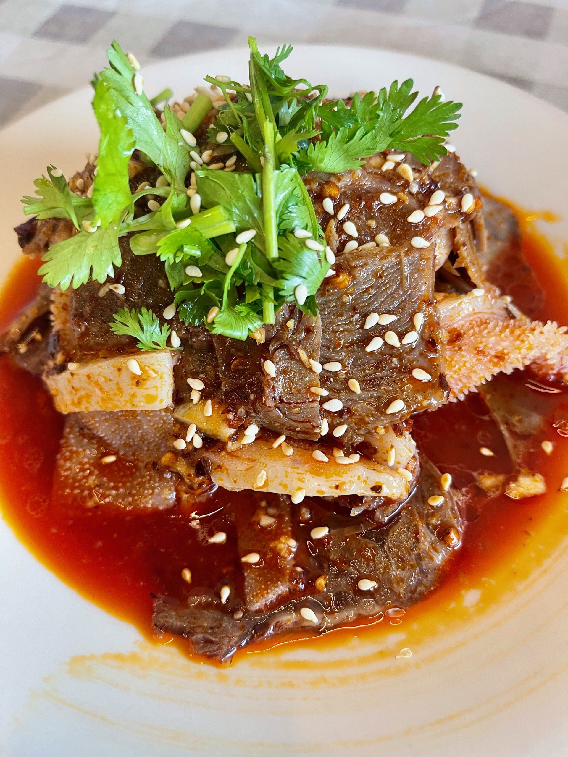 22 July 2022: If you liked the translation of “wonton,” you’ll love the translation from Chinese of Fuqi Feipian. On a menu, it reads something like “spicy cold beef,” but its literal translation is “husband and wife lung slices.” Okay, so the literal name is somewhat unappetizing, but Nio’s spicy cold beef is superb. Since I’ve already got you thinking twice about ordering this dish, you probably don’t want to read that the cold beef (actually about room temperature) includes tripe, the slightly rubbery (despite a lengthy preparation time) stomach lining.