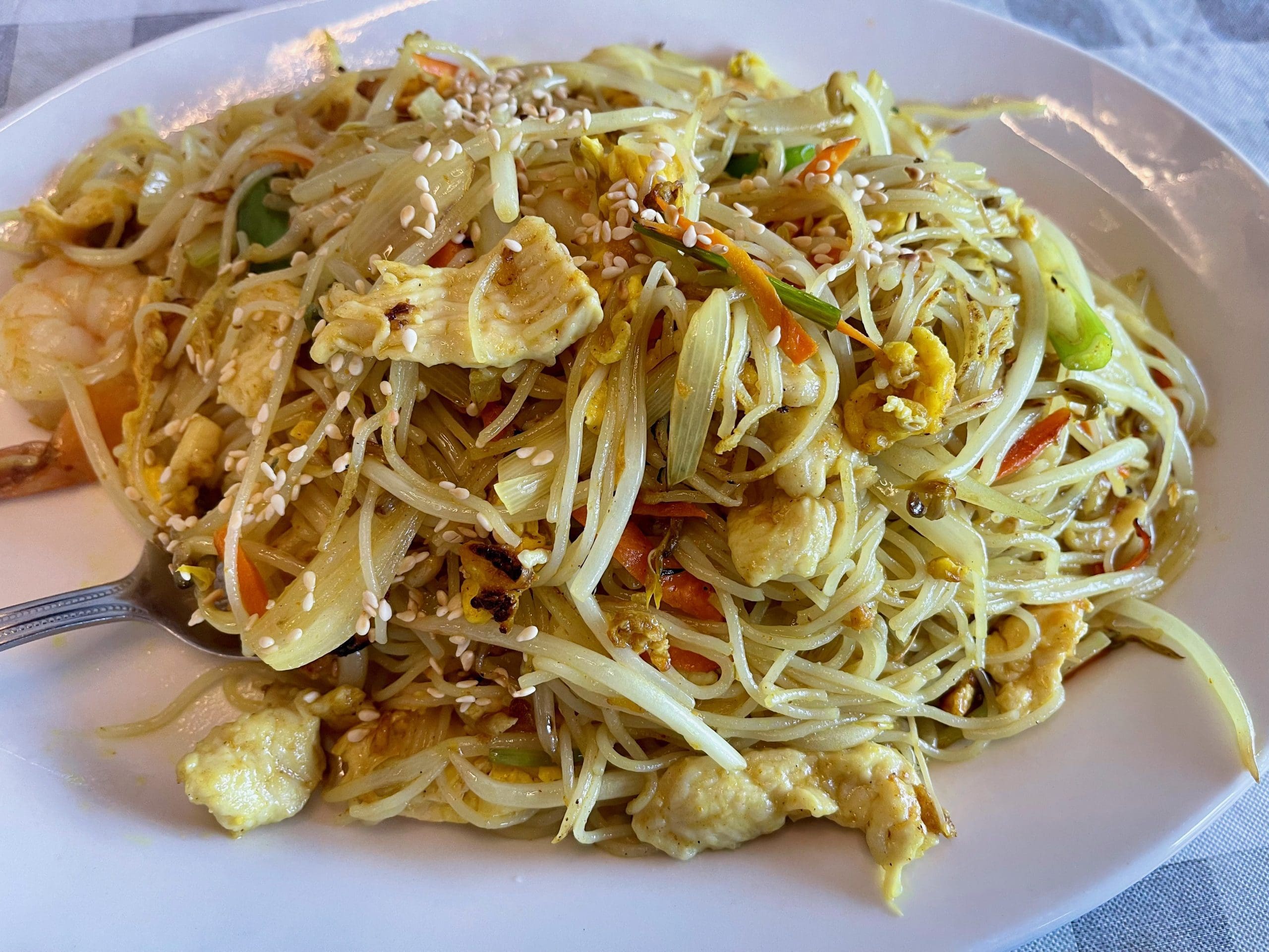 22 July 2022: My dear friend Ming Lee was a born-and-bred Singaporean. Every time he saw Singapore noodles on a menu he would remind me there is no such thing as Singapore noodles. “We have far too many noodles in Singapore to single any one type of noodle or noodle preparation style as Singaporean,” he would declare. Not that he didn’t like Singapore noodles. Singapore noodles are actually a Cantonese creation, a very popular dish at Cantonese restaurants and food stalls in Hong Kong. What makes them unique (and uniquely delicious) is curry powder, not necessarily an ingredient associated with Chinese cuisine. Whatever their origin, Singapore-style curry rice noodles are delicious. Tangles of vermicelli noodles; crisp, fresh vegetables, tender pork and oh, that pungent, delicious curry. It’s one of my favorite dishes at any Asian restaurant.