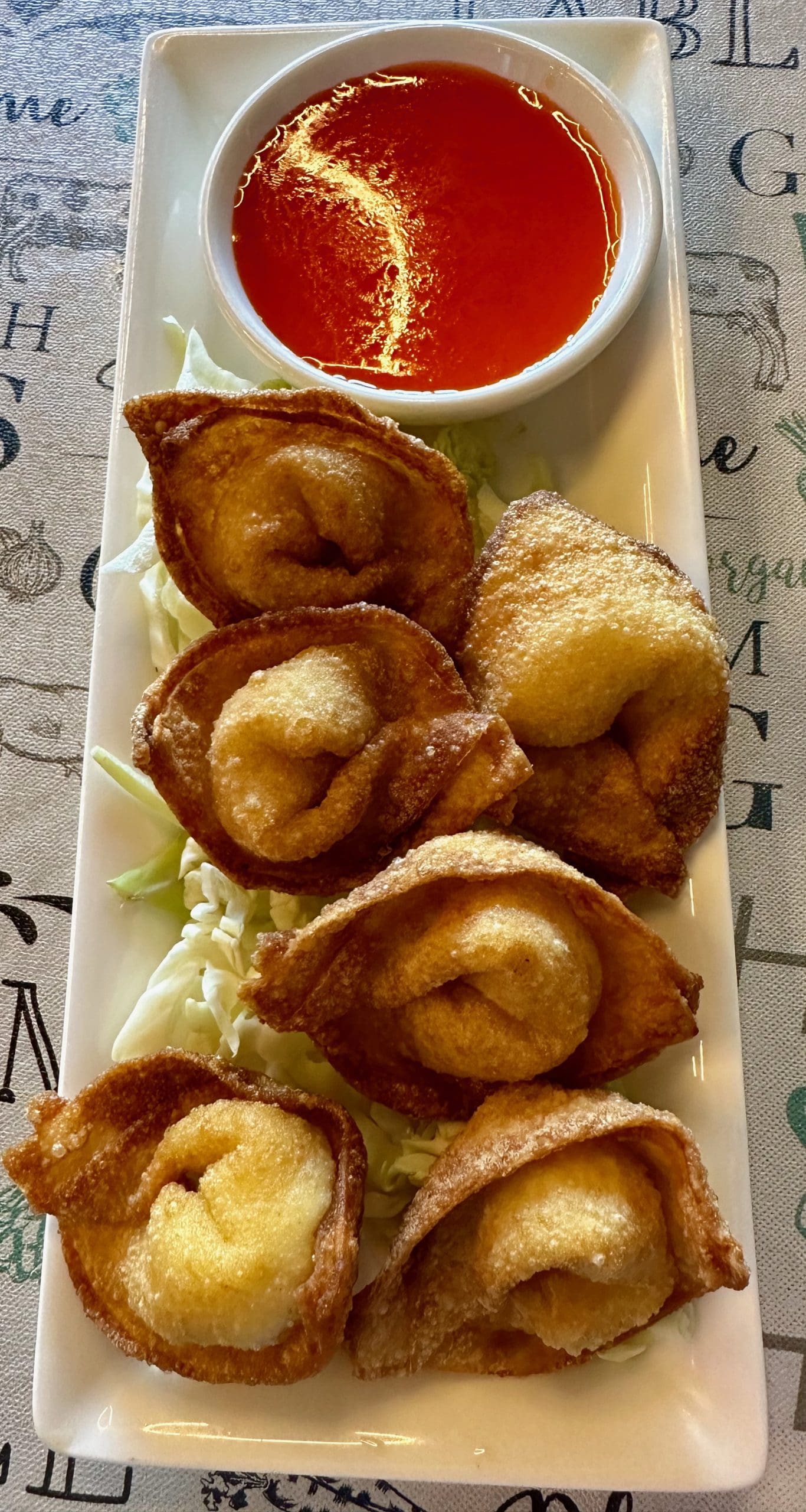 26 July 2023: Perhaps the one dish on Nio’s Szechuan menu that’s most antithetical to the heat and spice that pervades most of the menu is cheese wontons, a dish most Chinese restaurants call Crab Rangoon. This is a dish that has always mystified both Bill and me. At most Chinese restaurants in which we’ve ordered Crab Rangoon, it could almost pass for cheesecake stuffed into a wonton wrapper. The truth is Crab Rangoon is not a Chinese dish. It was invented in New York in the late 19th Century. Crab Rangoon consists of cream cheese and almost impossible to discern bits of imitation crab stuffed into a wonton wrapper then deep-fried. It’s served with a syrupy, neon, sweet and sour (sour is also difficult to discern) dipping sauce.