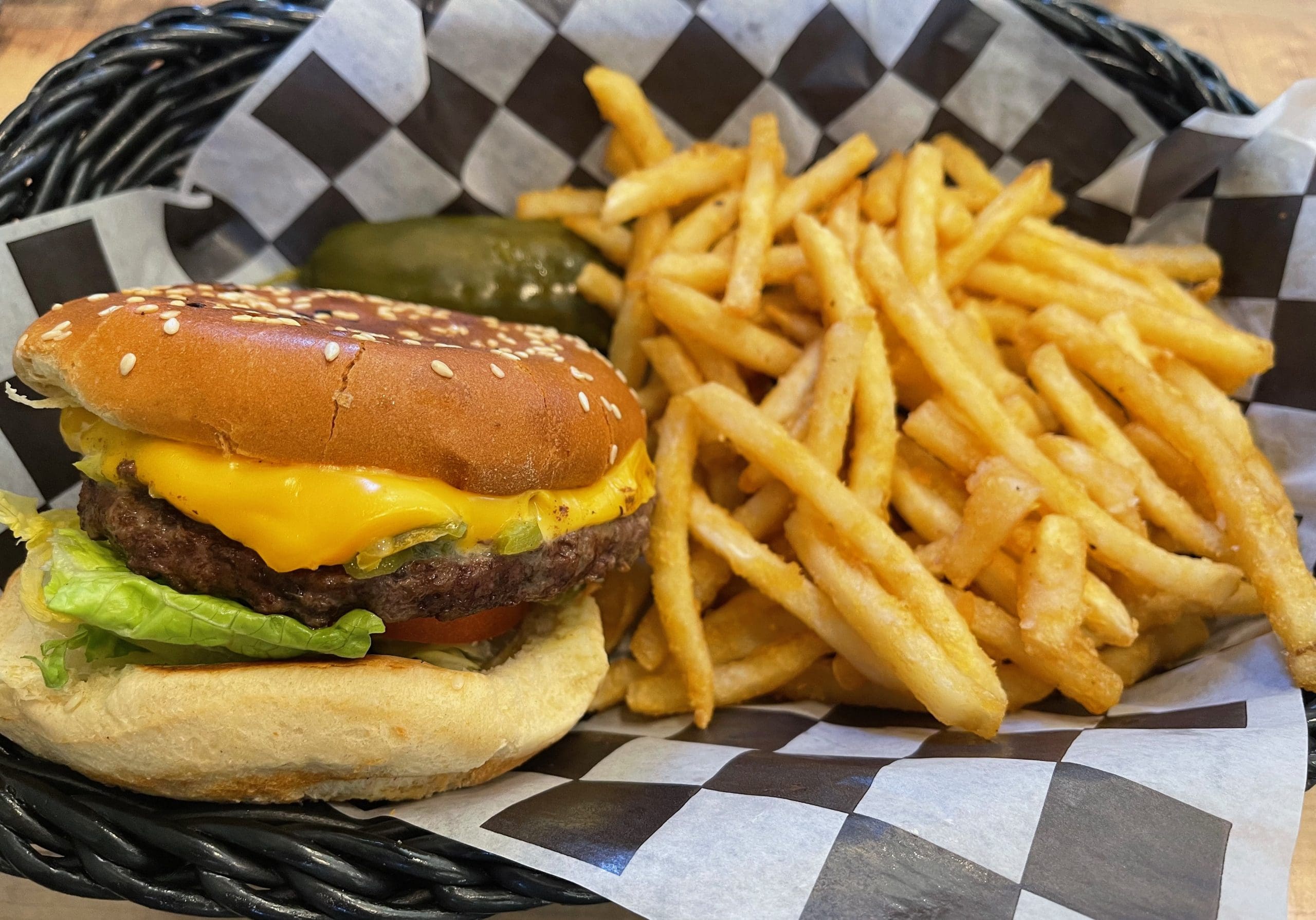 5 April 2022: In the May, 2022 edition of New Mexico Magazine, the Land of Enchantment’s sacrosanct green chile cheeseburger was celebrated. The cover story depicted an exemplar of one of our state’s most beloved foods. Order Hello Deli’s green chile cheeseburger and you’ll quickly find out why we love them so much. A thick beef patty topped with pleasantly piquant green chile then sheathed in a molten blanket of cheese is just the starter. Add lettuce, tomato and a smear of mustard and you’re in for a terrific treat between sesame seed buns. The burger is served with thinly-cut French fries and a pickle spear.