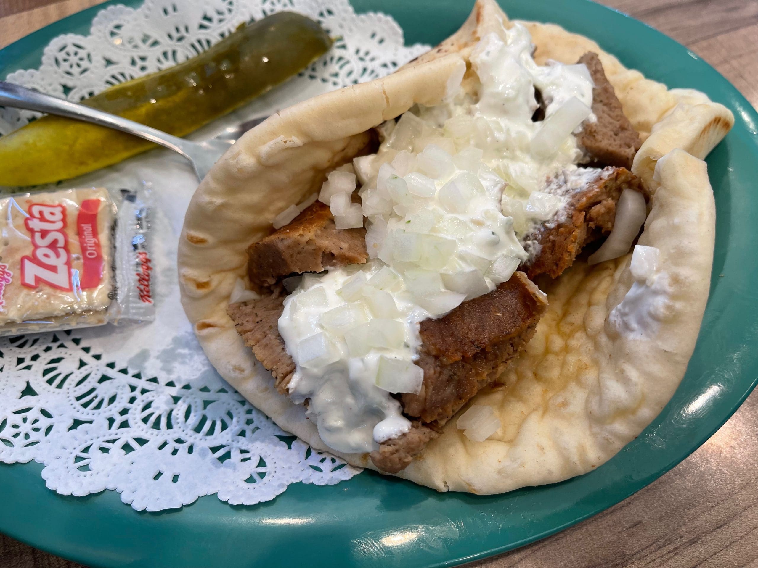 5 April 2022: With an founding owner named Marcus Cassimus, is it any surprise the menu includes a spate of Greek items: Hello Gyro, Olympic Omelet, Greek salad and the Hello Corfu salad. My Kim loves the Hello Gyro served with plenty of garlicky, tender gyro meat sliced thickly and nestled on a warm pita which also envelops onion, tomato and lots of creamy tzatziki sauce. This terrific gyro is served with a pickle spear and a two-pack of saltine crackers. The former makes sense. We weren’t sure about the crackers. In far too many Greek restaurants, we tend to order “double meat” not just because we love the lamb-beef amalgam, but some restaurants are rather parsimonious with their gyros. Not so at Hello Deli.