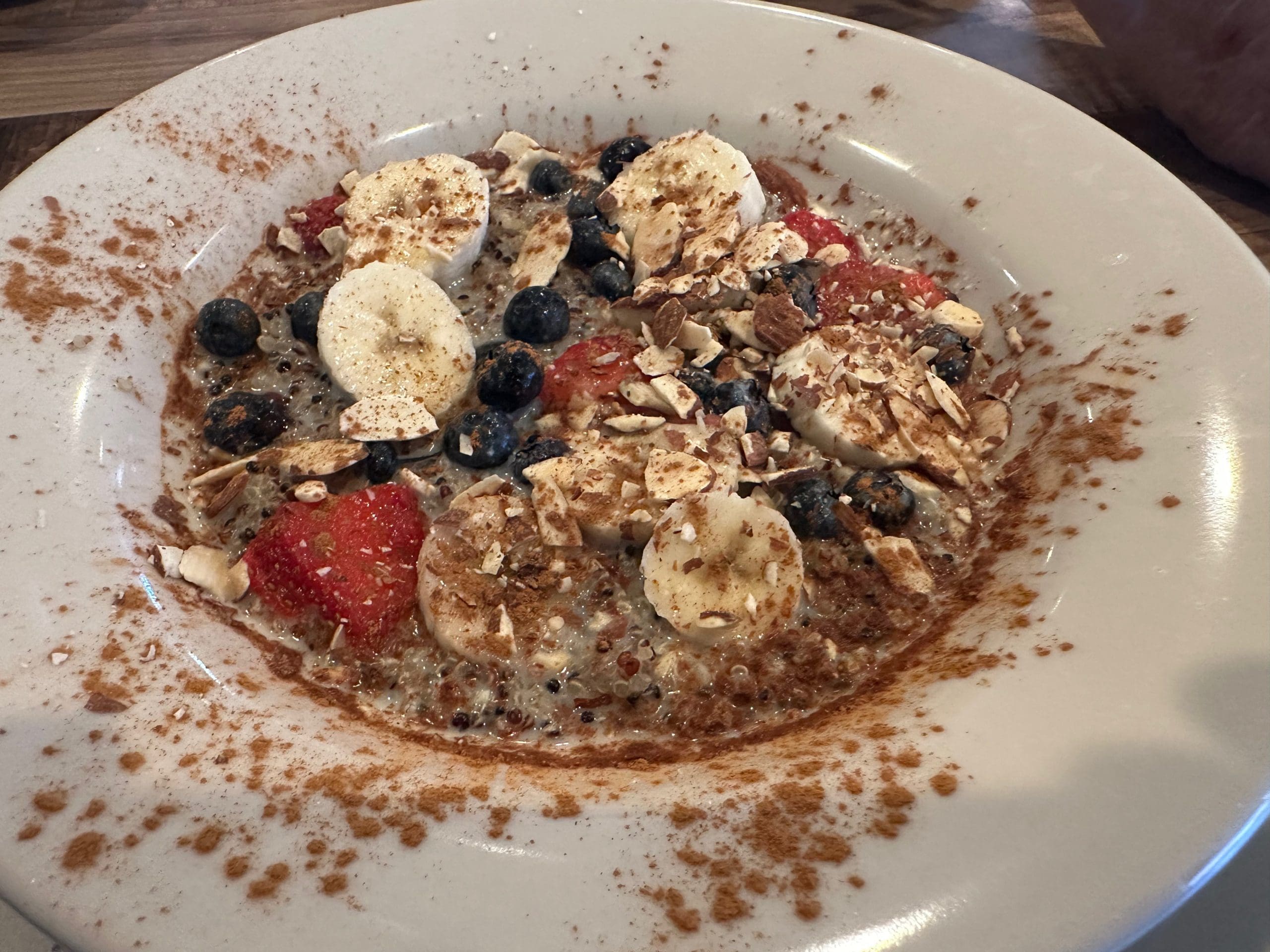 If you’ve ever had the fabulous “Betty Bowl” at Meraki’s Coffee & Market on Eubank, you’ve had a version of a power breakfast. It’s a much better way to wake up than talking shop with colleagues. Hello Deli offers both savory (tricolor quinoa, spinach, mushrooms, bell pepper, onion, and Feta topped with two eggs any style) and fruity power bowls (tricolor quinoa cooked in coconut milk topped with fruit, slivered almonds, cinnamon, and more coconut milk). It’s not quite as fruity as I may have liked, but the bananas, strawberries and blueberries have a fresh flavor. Cinnamon is the perfect condiment for this bowl.