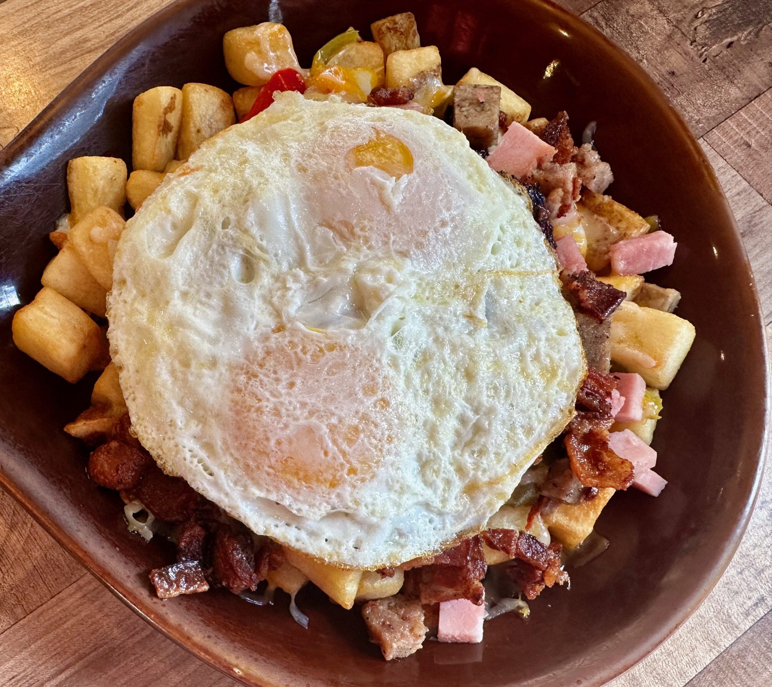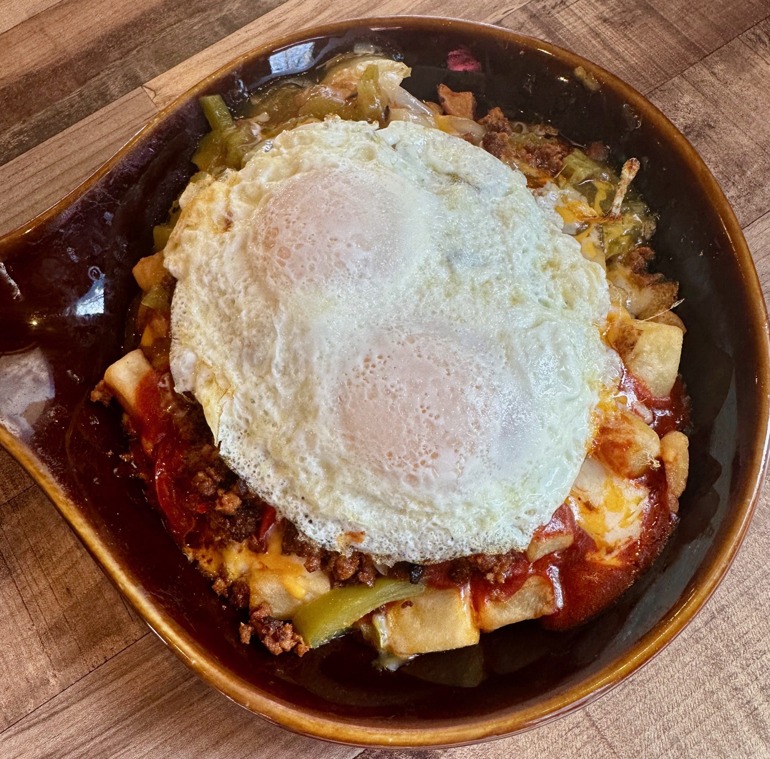 9 April 2024: Hello Deli has a thing for Santa Fe. Two of my favorite Hello Deli dishes are named for New Mexico’s capital city. Fittingly they’re just a bit different. The Santa Fe cakes (blue corn pancakes with Cheddar and Jack cheese, green chile and piñon baked right in) are everything you want in a pancake and more. Similarly, the Santa Fe skillet meal has absolutely everything you could conceivably want in a skillet meal. The red and green chile play very well with the chorizo. There’s nothing especially piquant on the skillet, but everything works oh-so-good together. This skillet may not weigh 300-pounds, but you’ll be challenged to finish it.