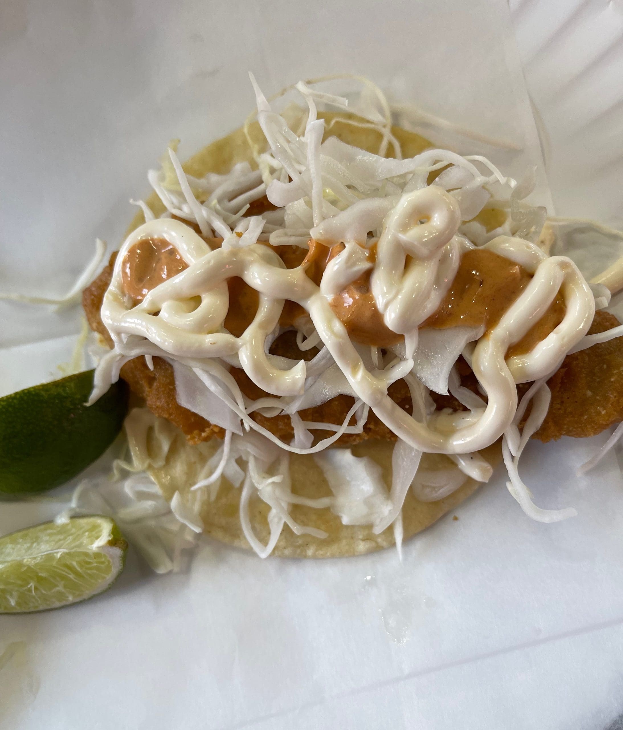 Much better (less salty, more flavorful) was an al pastor taco with generous amounts of pineapple and onion. The spicy marinated pork from which this taco was constructed comes from a vertical spit (similar to the spit from which gyros meat is shaved). Aromatics such chiles and achiote make this popular street food taco one of my favorites. Sr. Plata enjoyed the fish taco more than I did. That’s because he didn’t let his get cold. A crispy, breaded cod extends beyond the corn tortilla.