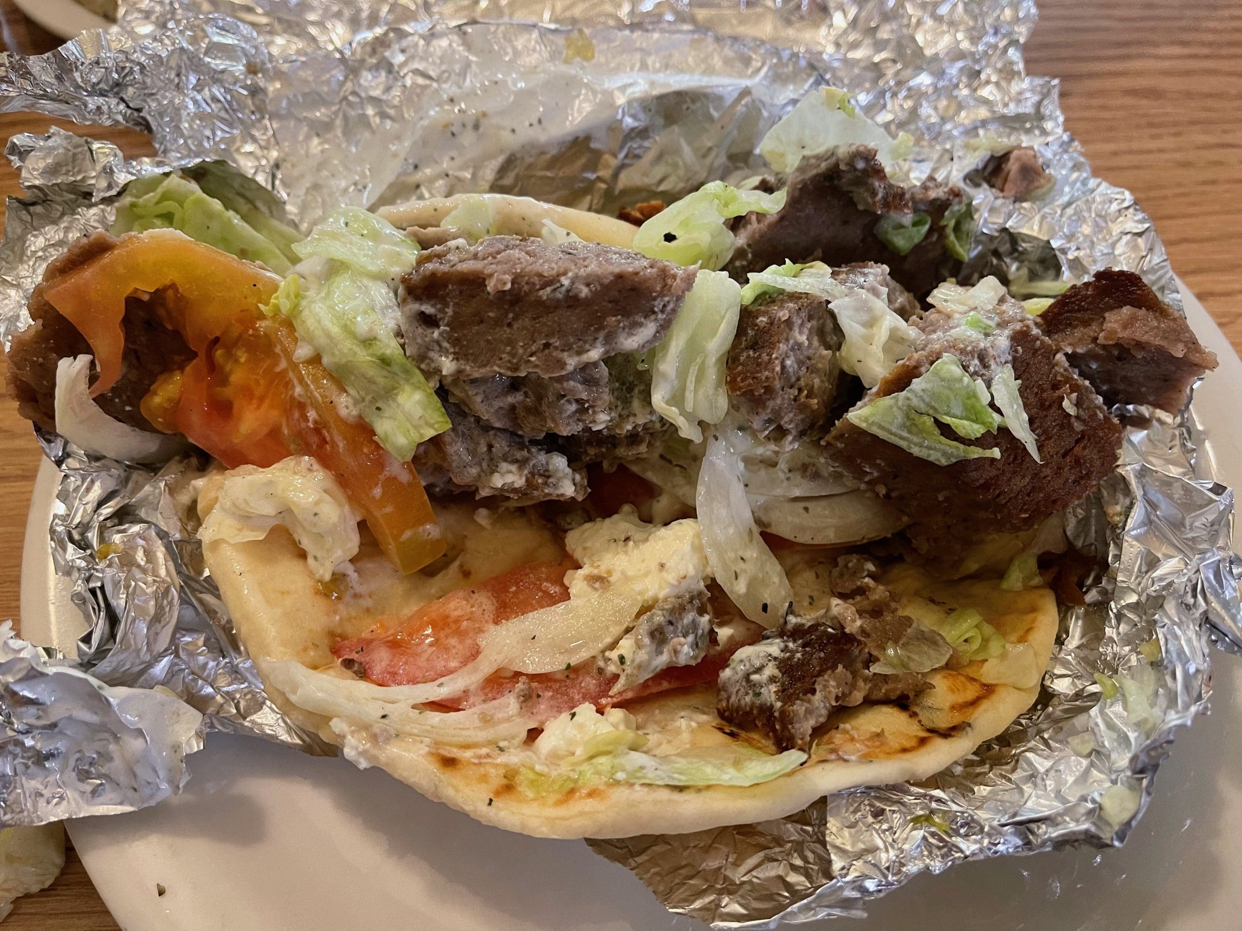 There are two different gyros listed on the menu–gyros (mixture of lamb and beef seasoned with Greek spices cooked on a spit, garnished with sour cream cucumber sauce and herbs) and gyros DLX (with onion and feta cheese on hand made Pita). My Kim had the (nothing about it is) regular gyros and was ensnared at first bite. We were surprised at just how large each chunk (yes, chunk) of that lamb and beef amalgam was. Some pieces were as thick as a burger, not at all like the thin shards of shaved meat we’ve experienced elsewhere. Greek spices imbued the meat with olfactory-arousing aromas and addictive flavors. Pita, one of the world’s most ancient breads, had a delightfully smoky flavor and soft, pillowy texture that made a nice home for the meat to nestle in.
