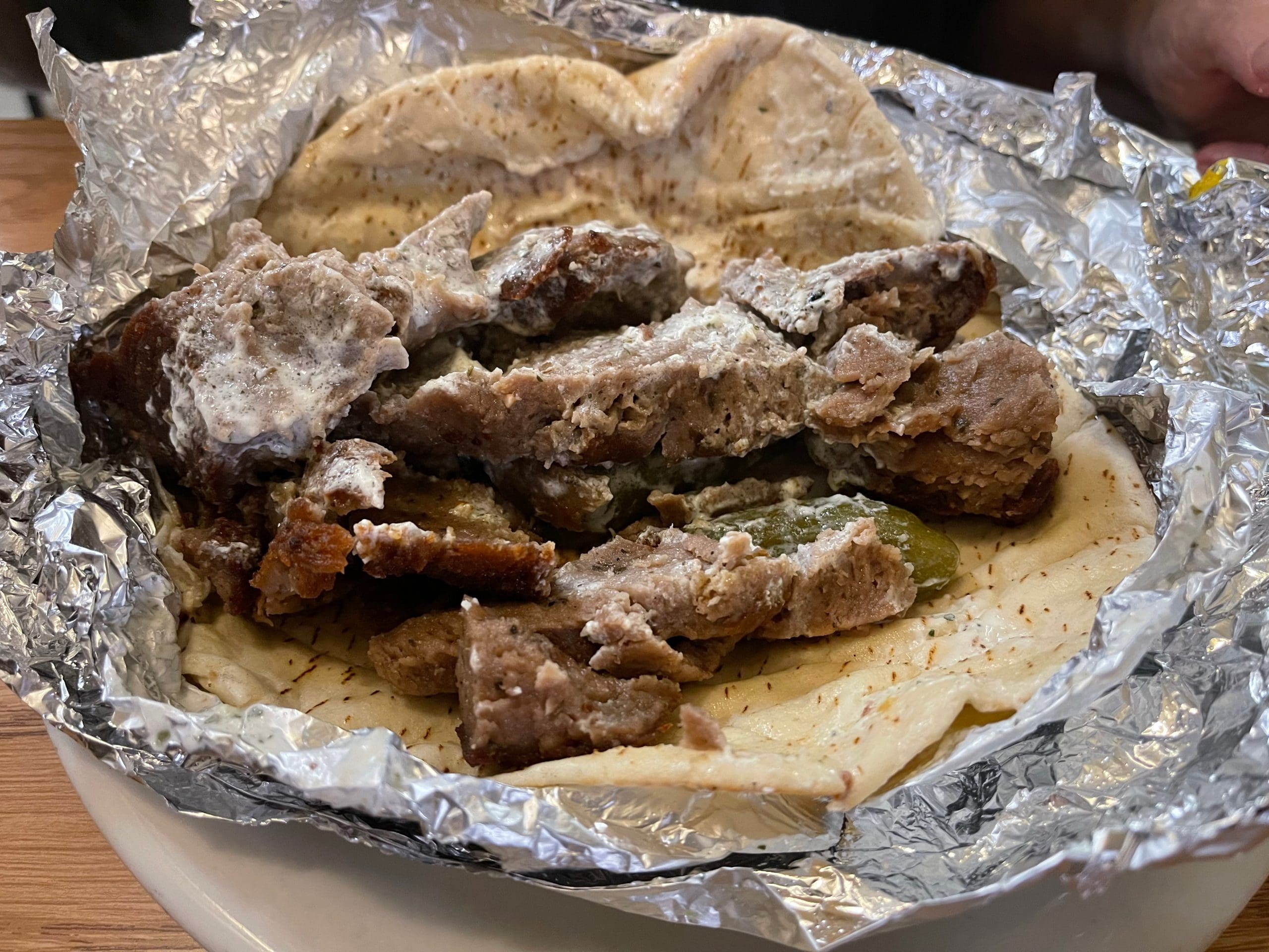 Alas, we were unable to try it even once. Our server nearly broke my heart when he told me the restaurant hasn’t been able to find lamb tongue in a while. Aargh! It’s a good thing there were no tall trees and short rope in the area. Our server offered little consolation, telling me gyros are probably the next best thing on the menu. Gyros? Aren’t all gyros just about the same? Thankfully that’s not the case. Haji Baba’s gyros are the very best we’ve ever had. As with all sandwiches on the menu, gyros are served with tomatoes, lettuce and pickles wrapped in Arabic bread.