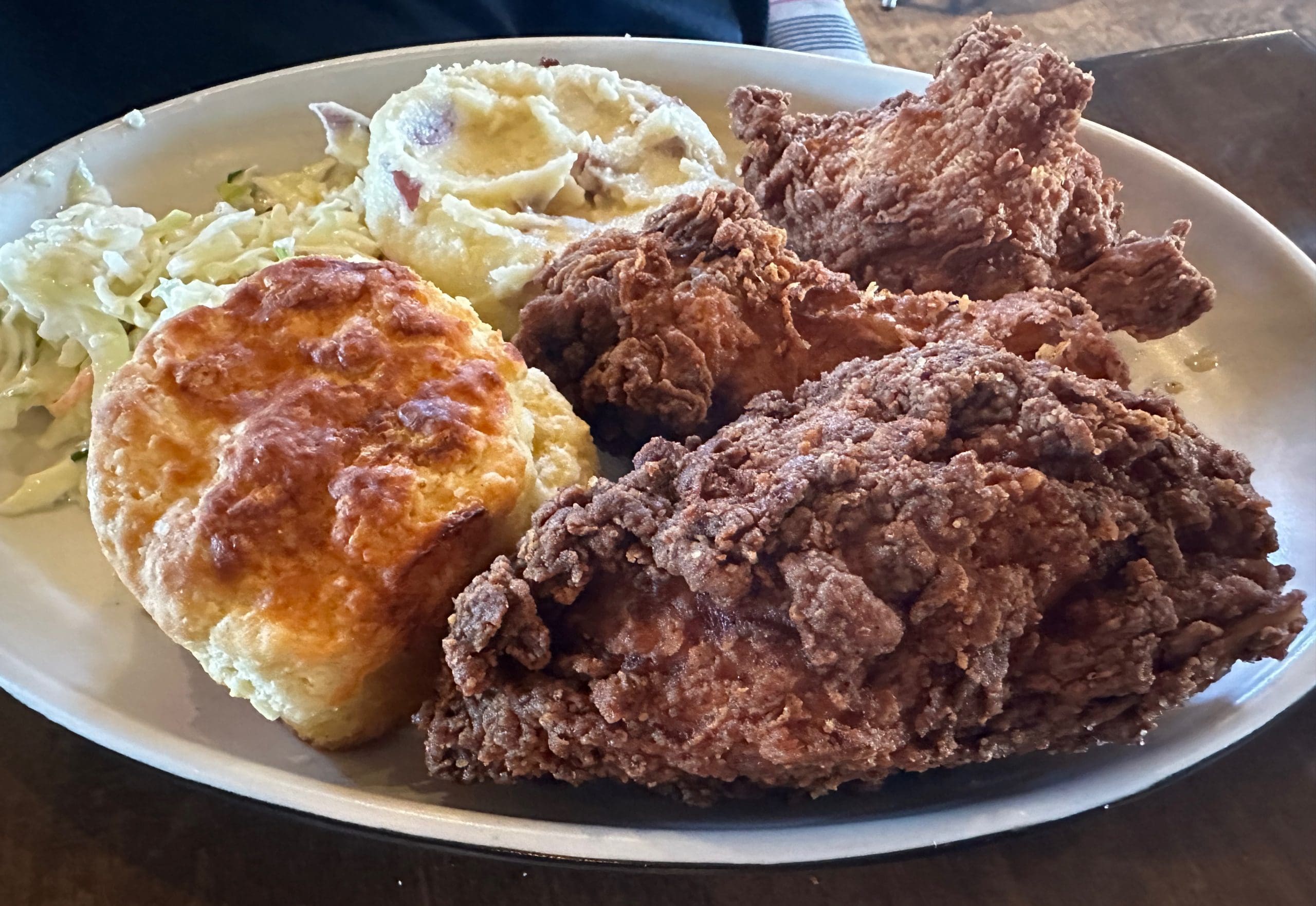 1 January 2025: Our friend Pastor Shelly Smith told us blackeyed peas are his favorite way (after prayer, of course) to start off his new year. My Kim considers it starting off the year right by having fried chicken. Culinary Dropout’s fried chicken comes with a warning: “Be patient! It’s worth it.” In addition to a warning, it comes with a buttermilk biscuit, smashed potatoes and gravy (which she passed on). I consider it evidence that I’m loved when my Kim shares her chicken with me. With three pieces–breast, wing, leg–of chicken–there was plenty of perfectly prepared poultry to go around. My Kim eschews breading and this chicken was rather heavily breaded. When she peeled off that breading, wisps of steam wafted toward our anxiously awaiting nostrils. It tasted as good as it smelled.