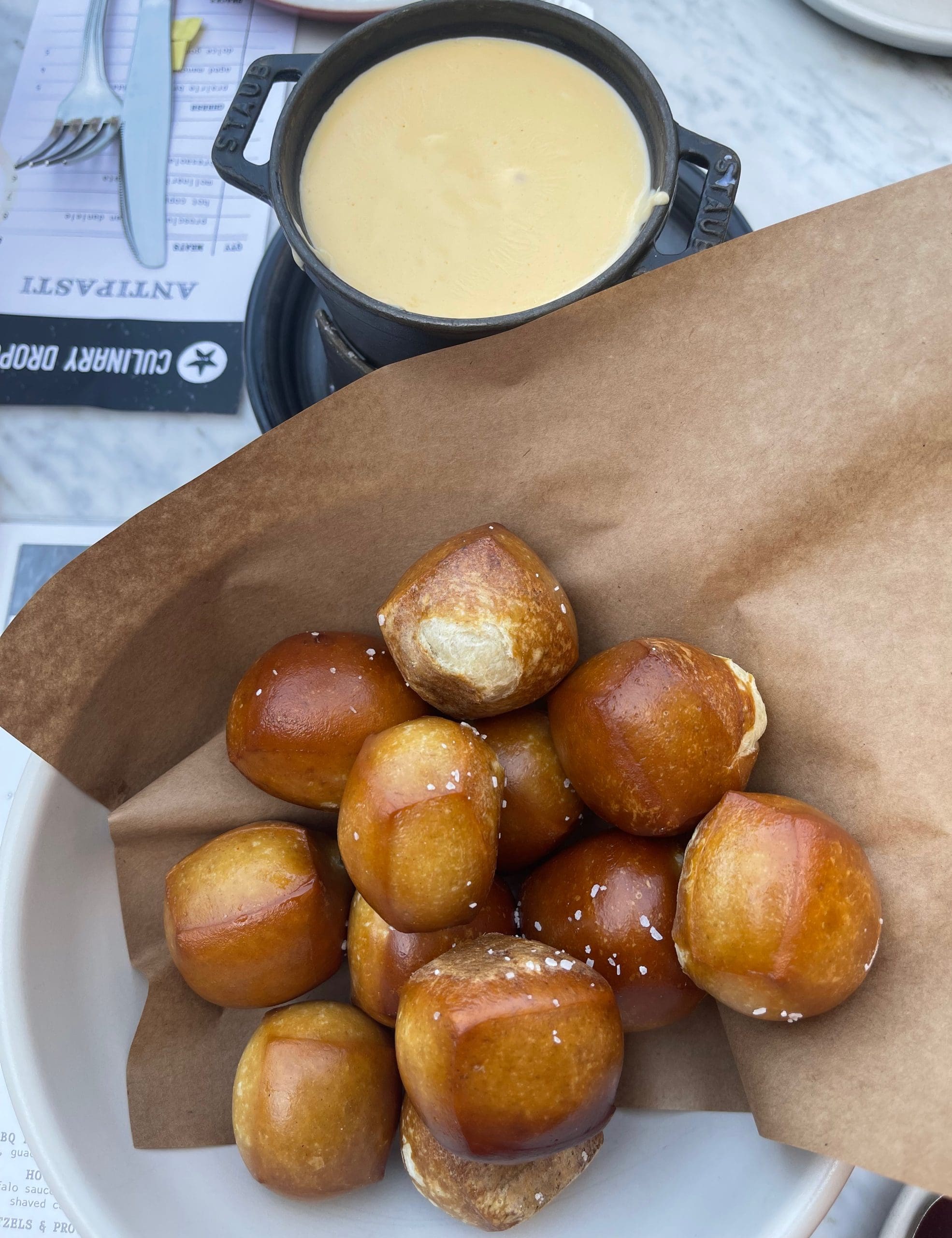 1 May 2022: One commonality among most of the guests seated on the patio was an order of soft pretzels and Provolone fondue. These are not the ropes of dough fashioned into the shape of a loose knot that we think of when contemplating pretzels. Instead, these are more puffy bread roll-like than similar to a cracker with all the qualities of great bread. A pliable exterior gives way to a soft interior. Sea salt is sprinkled lightly on the glossy surface. As wonderful as the soft pretzels are on their own, the Provolone fondue puts them in rarefied air–gourmet pretzels so good you’ll forever change your conception of pretzels.