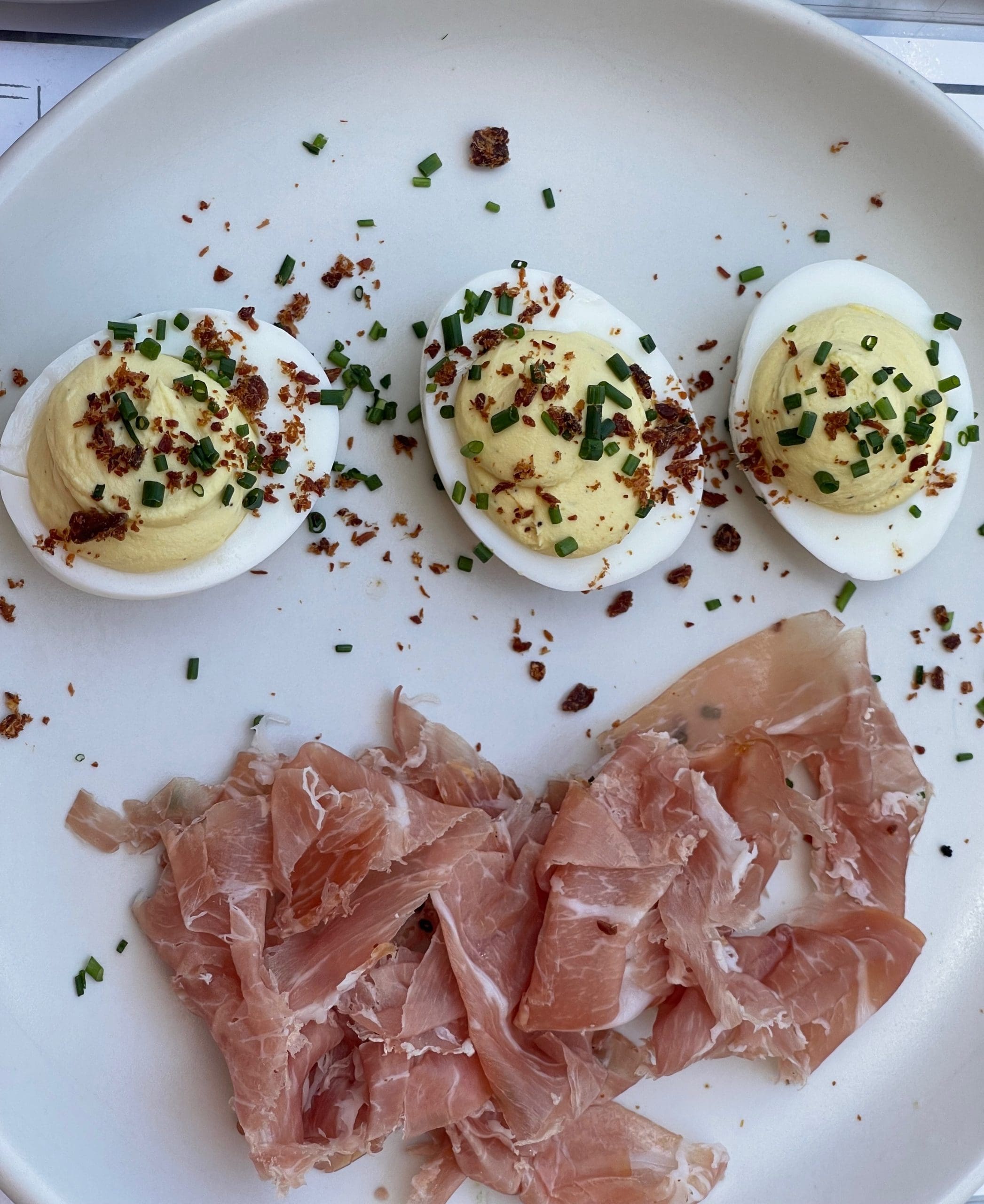 1 May 2022: After thoroughly enjoying our pretzels and yesterday’s soup (that may have come from today), we found ourselves too full to even share an entire entree. Rather than make ourselves miserable, we selected one item–Prosciutto di San Daniele–from the “Meat and Cheese” section of the menu and one item–Prosciutto Deviled Eggs–from the “Snacks” section. When deviled eggs were practically de rigueur on restaurant menus a few years ago, we rarely ordered them. Seeing them on the Culinary Dropout menu must have rekindled any affection we may have had for them. If all deviled eggs are as good as these, deviled eggs may be in for a comeback. The balance of devil (tartness, spice) and sulfuric qualities of the egg was a perfect marriage. By the way, perhaps the best description I’ve seen for the flavor of a hard-boiled egg is “mild fart.” Because you can never have enough prosciutto, we had one of our favorite varieties. Predictably, it was magnificent.
