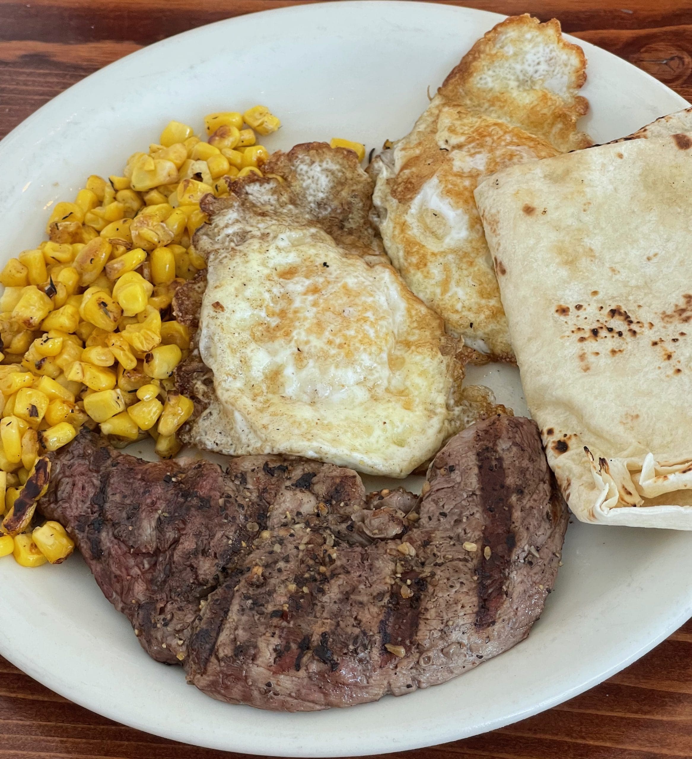 Never mind Native American and New Mexican food. Sometimes my Chicago-born-and-bred bride craves the foods (mostly meat and potatoes)of her homeland and not even chile can assuage her cravings. Her cravings were sated with a plate of steak and eggs (she eschewed potatoes and asked for corn). She’s a much bigger fan of steak than her husband so we’ll have to take her word for it that this plate was excellent. Me, unless it has red and (or) green chile, I won’t touch a steak at a New Mexican restaurant.