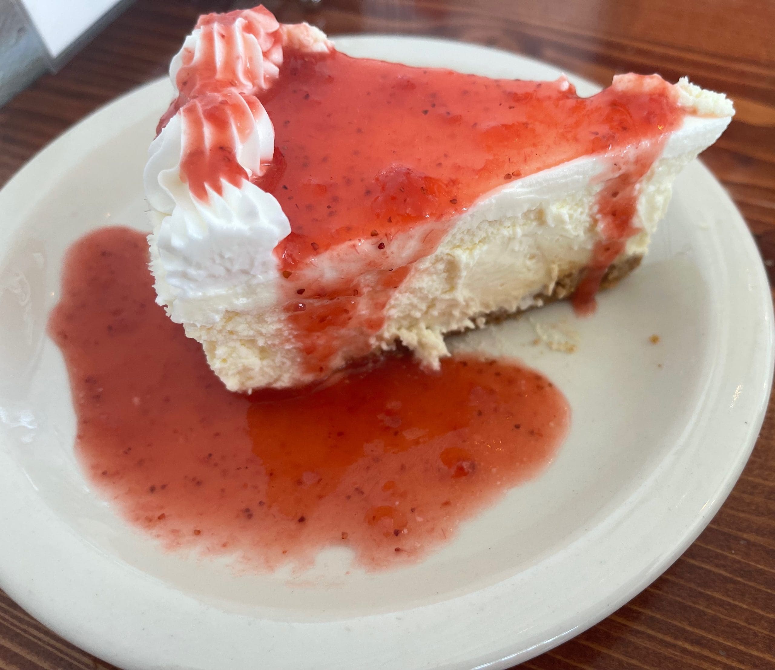 Dessert options include mini fry breads covered in powdered sugar and topped with chocolate syrup and ice cream (two scoops in a bowl). A cheesecake in the pastry case was my Kim’s choice. Topped with a strawberry sauce, it was a rich, creamy and delicious postprandial choice. So was the watermelon agua fresca, a refreshing beverage any time of year but especially on a hot May day.