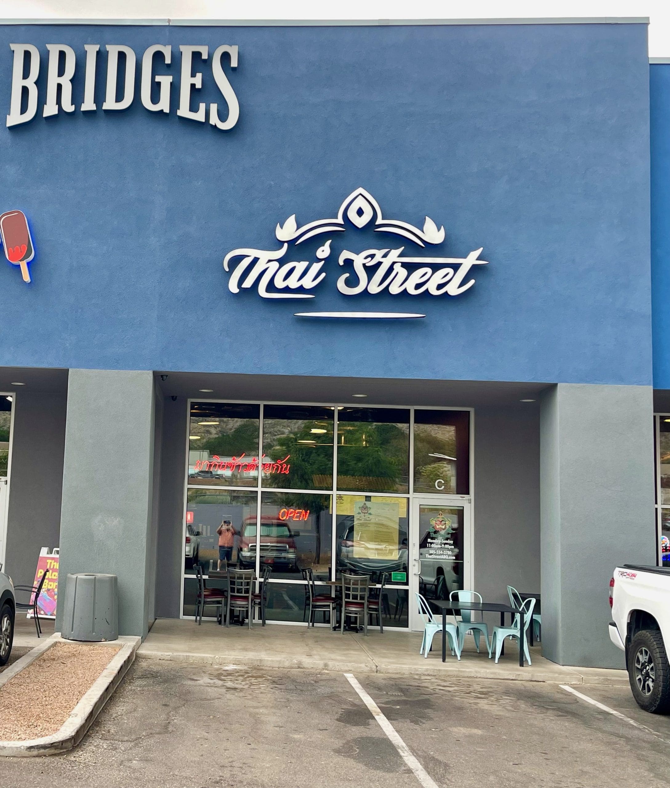 Weather-permitting, the best seat in the house might just be on the exterior patio where views of the spectacular Sandias are available. Those views and very good food at Thai Street are just two of the reasons The Bridges on Tramway are becoming a dining destination.