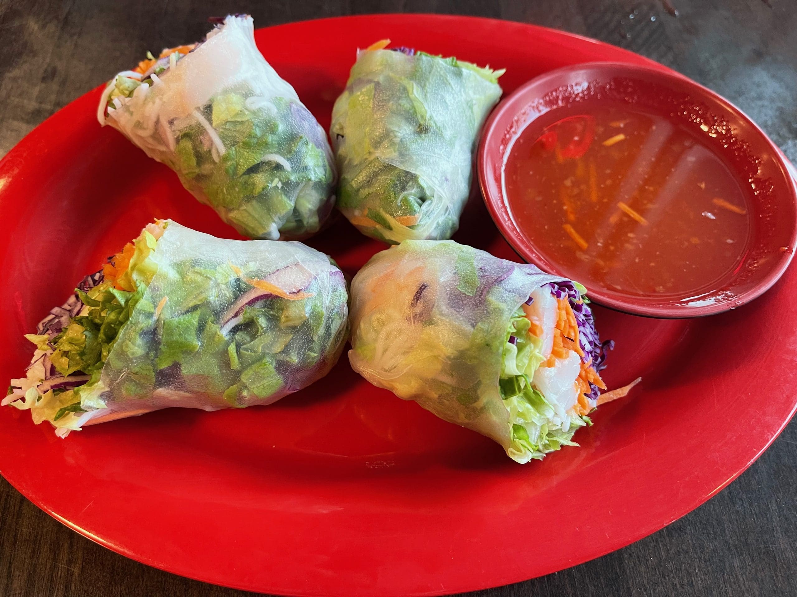 Spring rolls are believed to have originated in China sometime between 266 and 420 A.D. Originally a seasonal food made for Chinese New Year banquets, they were traditionally consumed also during Spring when families needed to rely on preserved foods and pickled vegetables. Because of the widespread influence of China throughout Southeast Asia, many Asian nations created their own version of Spring rolls. One commonality is that they’re made by rolling a paper-thin rice paper wrapper with fillings. Spring rolls at Thai Street are not only well-stuffed, they’re colorful and beautiful: orange julienne carrots, purple cabbage, green lettuce and pinkish shrimp. Served with a translucent sweet-savory sauce, they’re a great way to start a meal.