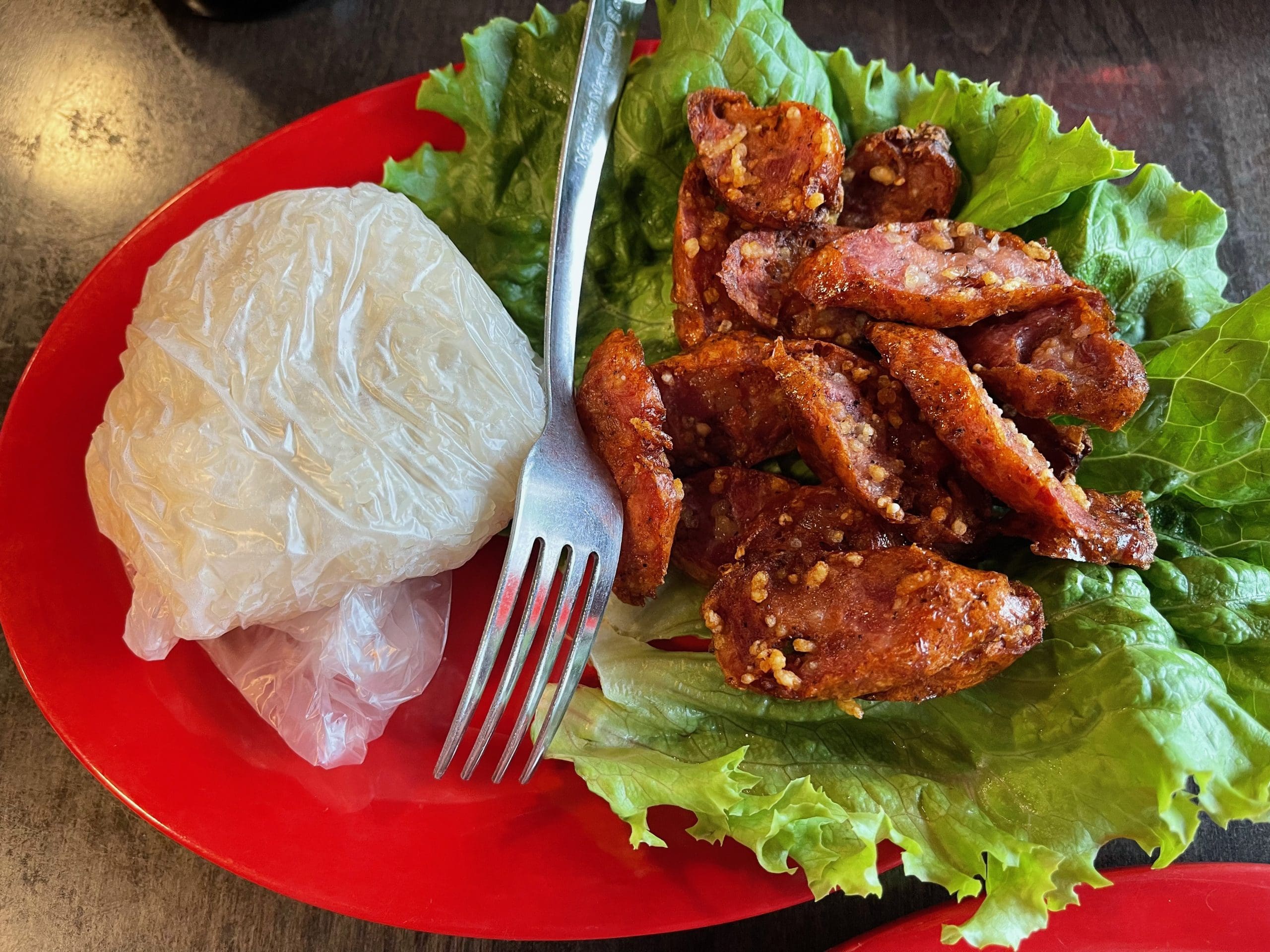 As with so many Thai dishes, Thai sausages are replete with flavor. While many other nations prefer making sausage by curing and smoking, the preferred method in Thailand is fermenting and drying. This method lends flavors unique to the sausage; they’re unduplicated anywhere in Asia. Sausages are a popular street food as well as a breakfast staple. Thai Street serves its Thai sausage with sticky rice in the style of Isan, a region in Northern Thailand. It’s customary to eat sausage with your hands, and sticky rice makes it quite easy to grab and clump food into bites. We were pleasantly surprised at the crispiness of Thai Street’s sausage, but not surprised at how much we enjoyed it.