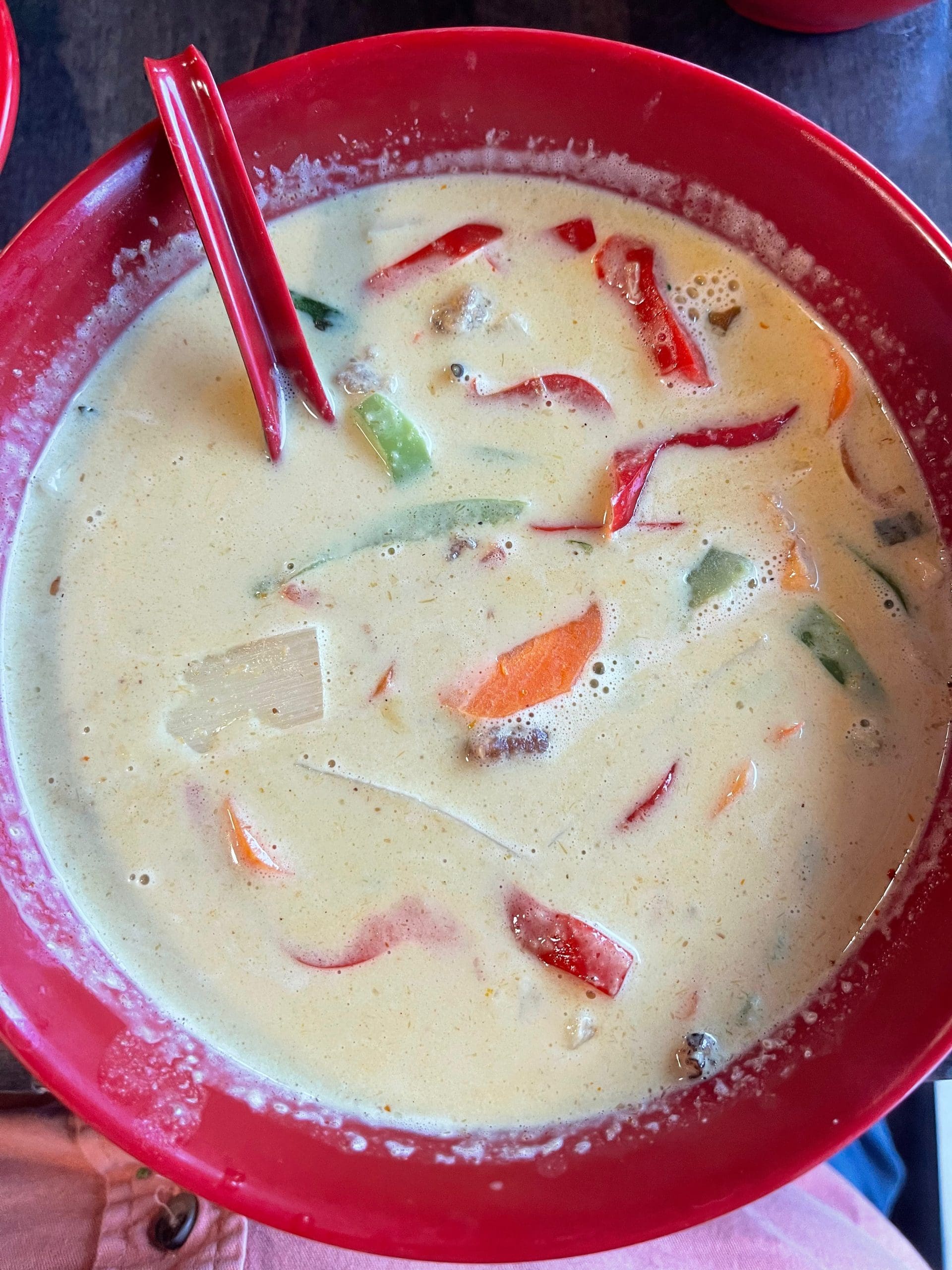 Habitues of Gil’s Thrilling… have probably wearied of me whining about how sweet most Thai curry at Albuquerque’s Thai restaurants can be. Thanks to Thai Street, you’re getting a reprieve. Not only is the yellow curry (pineapple, coconut milk, bamboo, bell peppers, carrots, basil) pleasantly piquant, it didn’t won’t leave you pinging off the wall from sugar overload. Yellow curry is typically the most mild of all Thai curries with a pleasant richness and sweetness. Even at the “Thai hot” level of piquancy, flame-eating New Mexican’s shouldn’t have any problem with it. I used to think of yellow curry as a “starter curry,” but even yellow curry is delicious.