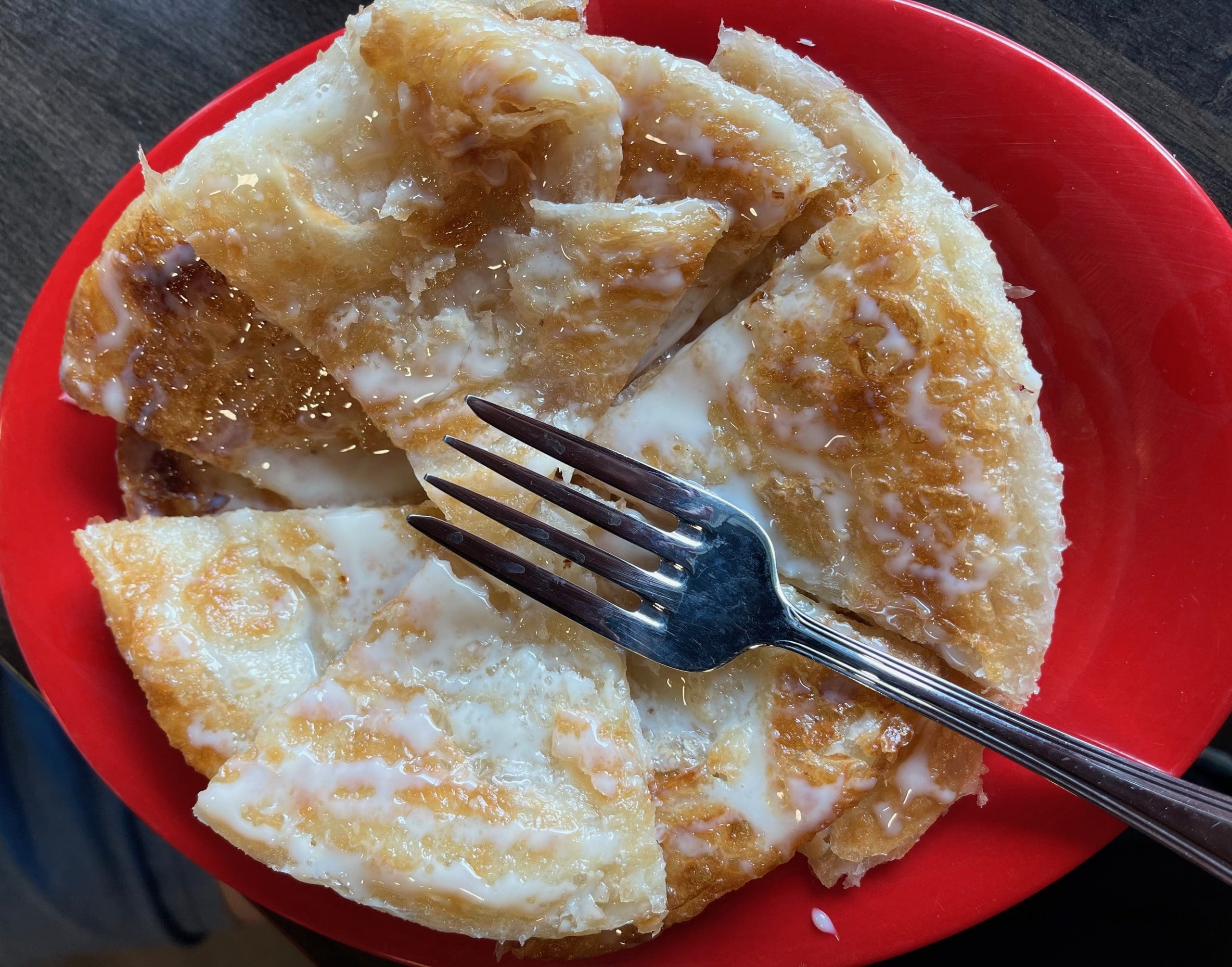 Thai Street offers four desserts–banana samosa, mangos with sticky rice, Thai roti and Thai tapioca pudding–two of which aren’t often seen in this parts. Thai roti is–along with mangoes and sticky rice–one of my favorite dessert anywhere. While roti is a traditional flatbread from the Indian subcontinent, in Thailand the pan-fried bread is often preferred as a dessert. Roti itself is thin and crispy, similar in texture to a layered phyllo dough pastry in Greece. At Thai Street, the multi-layered roti is slathered generously with sweetened, condensed milk. It’s a flaky, fabulous way to finish a meal.