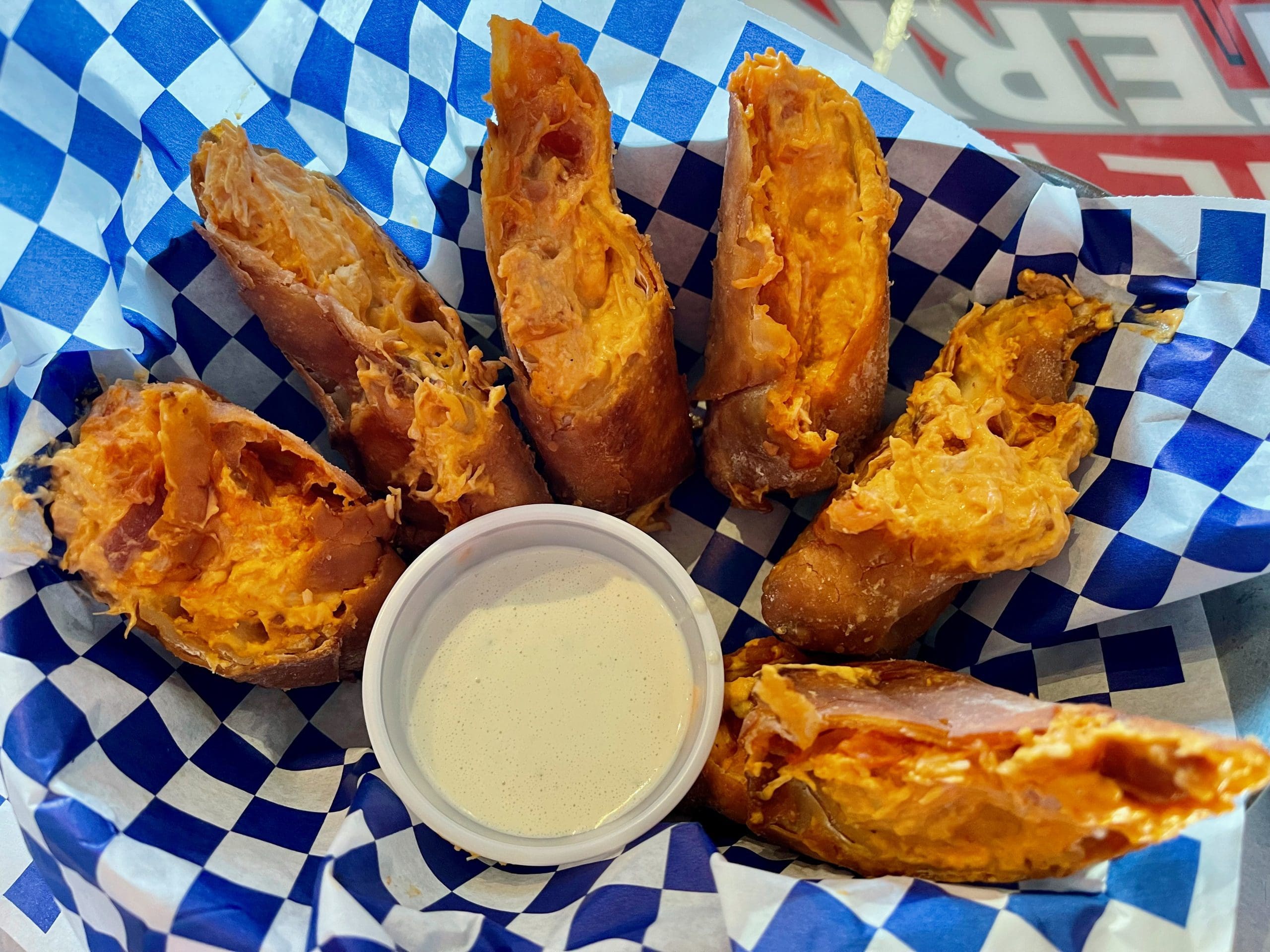 7 August 2022: One of the more intriguing starters are buffalo chicken egg rolls (chicken, cream cheese, red hot slaw served with blue cheese or ranch dressing) proof that a creative chef can create egg rolls from virtually anything in the pantry or fridge. It’s a good idea, but not quite as good as you might imagine. The chicken and red hot slaw, on their own, would have been very satisfactory, but molten cream cheese just renders this appetizer rather dreary–and I’m a bona fide turophile prone to complaining about “not enough cheese.” Neither ranch nor blue cheese dressing could do much to improve this so-so starter.