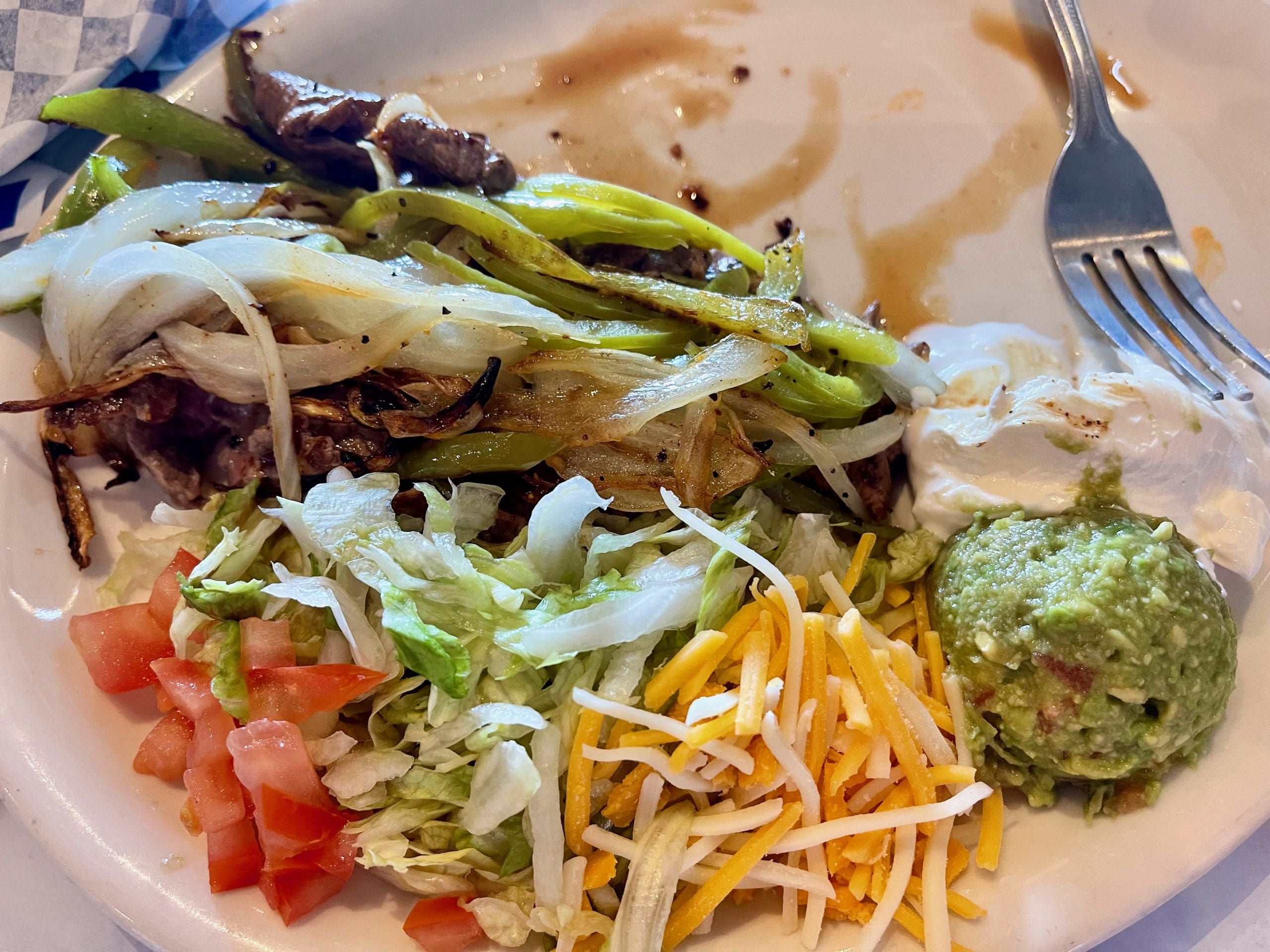 7 August 2022: Much better are the Turquoise fajitas (your choice of chicken, beef or shrimp served with pintos, green cauliflower rice, tortillas and “all the fixings). Those fixings were shredded Cheddar, lettuce, tomatoes, sour cream and guacamole. In other words, the usual. No matter what we add to fajitas what really matters is the protein of our choice and the green peppers and onions with which they’re prepared. My Kim raved about both the caramelized onions and green peppers almost as much as she did about the beef and chicken. The tortillas were of optimum size to support large scoops without falling apart.