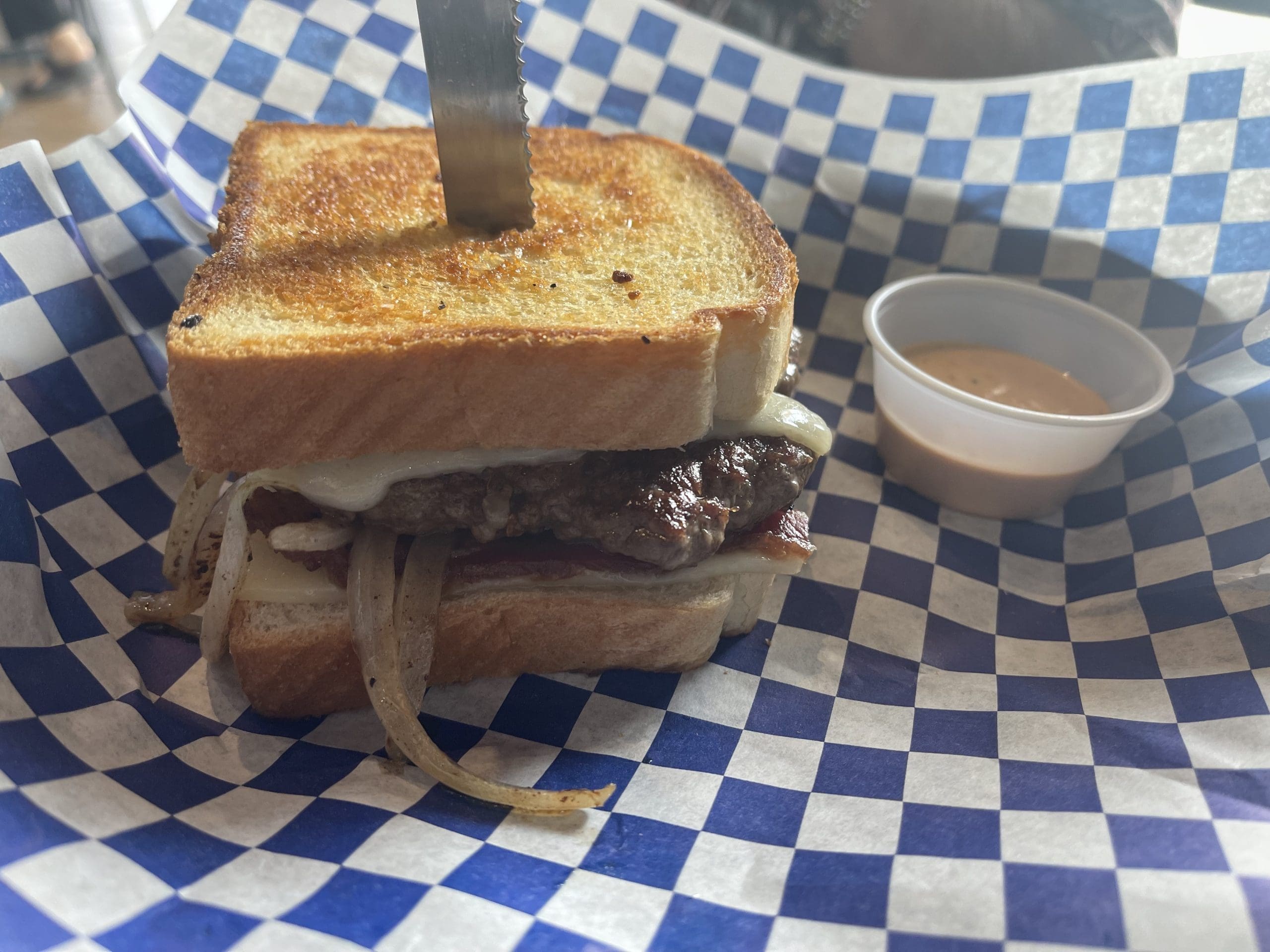 21 May 2023: How many of you have ever wondered if a patty melt is just a burger with a few modifications. The Burger Lab certainly has pondered that Jack Handey-level deep thought. In fact, the Lab actually defines the distinction “Unlike a burger, with its distinct patty and bun, a patty melt has no boundaries.” Hmm, I don’t believe burgers have any boundaries and have created a few monstrosities replete with sundry ingredients. Burger Lab goes on to define the components of a patty melt: rye bread, cheese, beef patty and onions. Sounds pretty limited to me. To paraphrase Clara Peller “where’s the green chile?”.