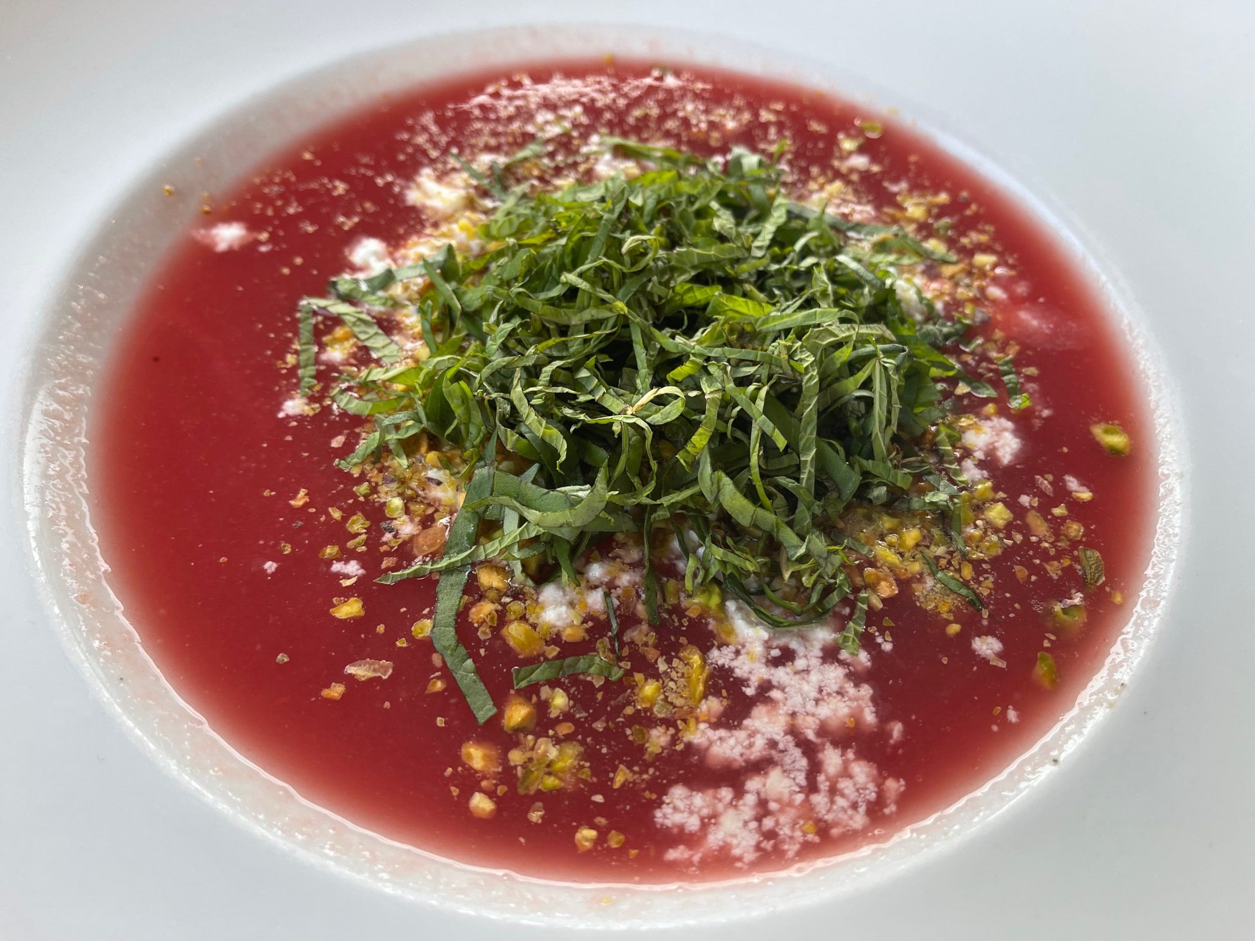 Seeing a heirloom tomato and watermelon gazpacho soup on the Soups & Salads section of the menu reminded us of the cartoon depicting a woman attired in her Victorian finery complaining to her server, “Waiter, this soup is cold.” The waiter responds “It’s gazpacho, ma’am.” Her reply “Very well, Gazpacho, this soup is cold” speaks volumes about her knowledge of cold soups. In truth, most of us equate soup as something warm to be enjoyed during cold days. We don’t always remember there are cold soups that have a cooling effect during warm weather days. Among the most famous is gazpacho, a soup which originated in Spain.