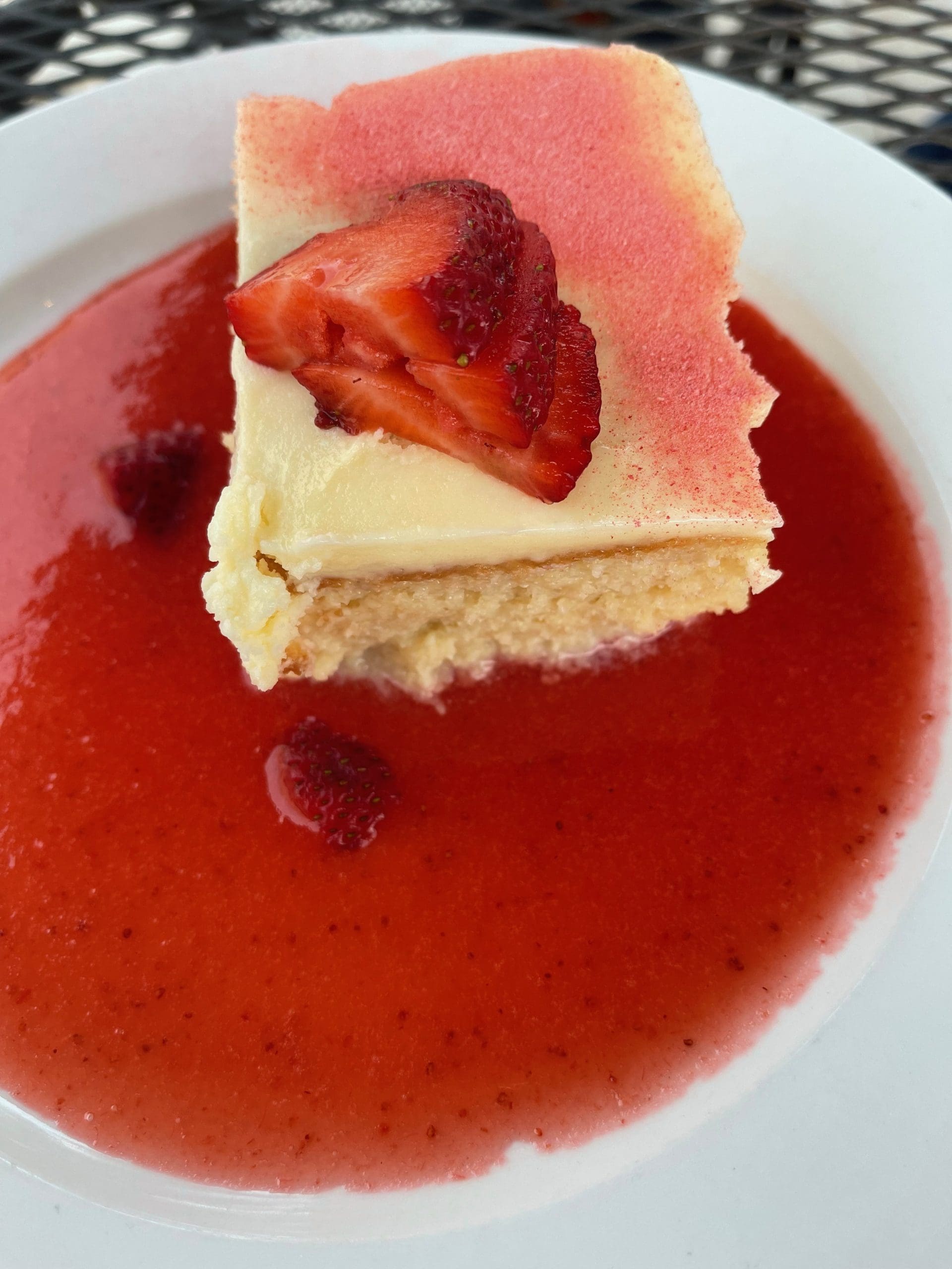 Writer Anne McManus shares an undeniable truth about desserts: “It’s the finale. It’s the last impression. A bad dessert can ruin the meal.” A great dessert, on the other hand, can be the highlight of an otherwise forgettable meal. Ideally, a memorable meal should culminate in an equally (or nearly as good) tremendous dessert. For my Kim, the tres leches cake was as good as anything else we had during our meal. It may resemble a moist three-milks cake surrounded by a strawberry moat, but that tangy strawberry sauce lent a wonderful contrast to the ultra-rich, creamy cake.