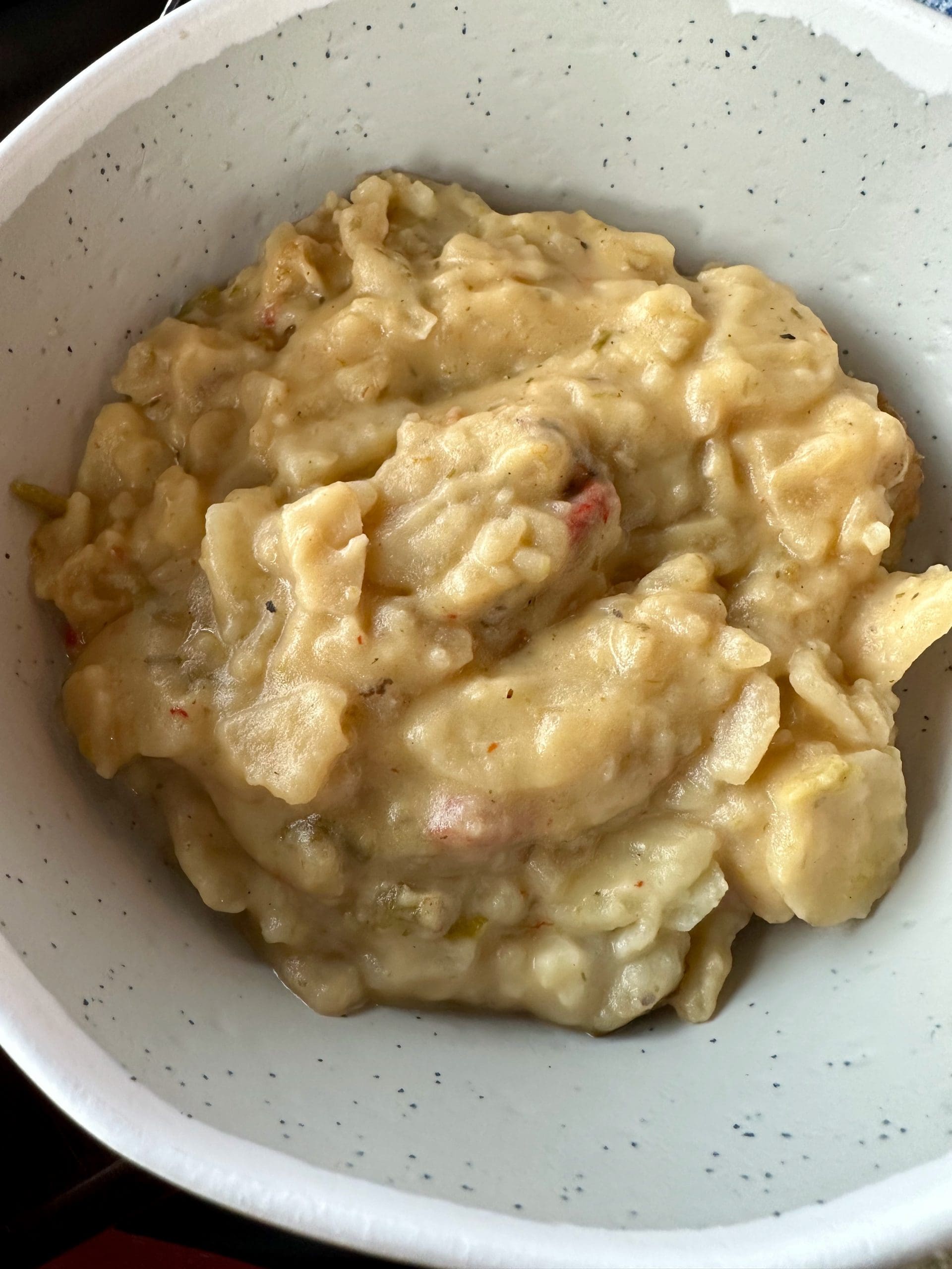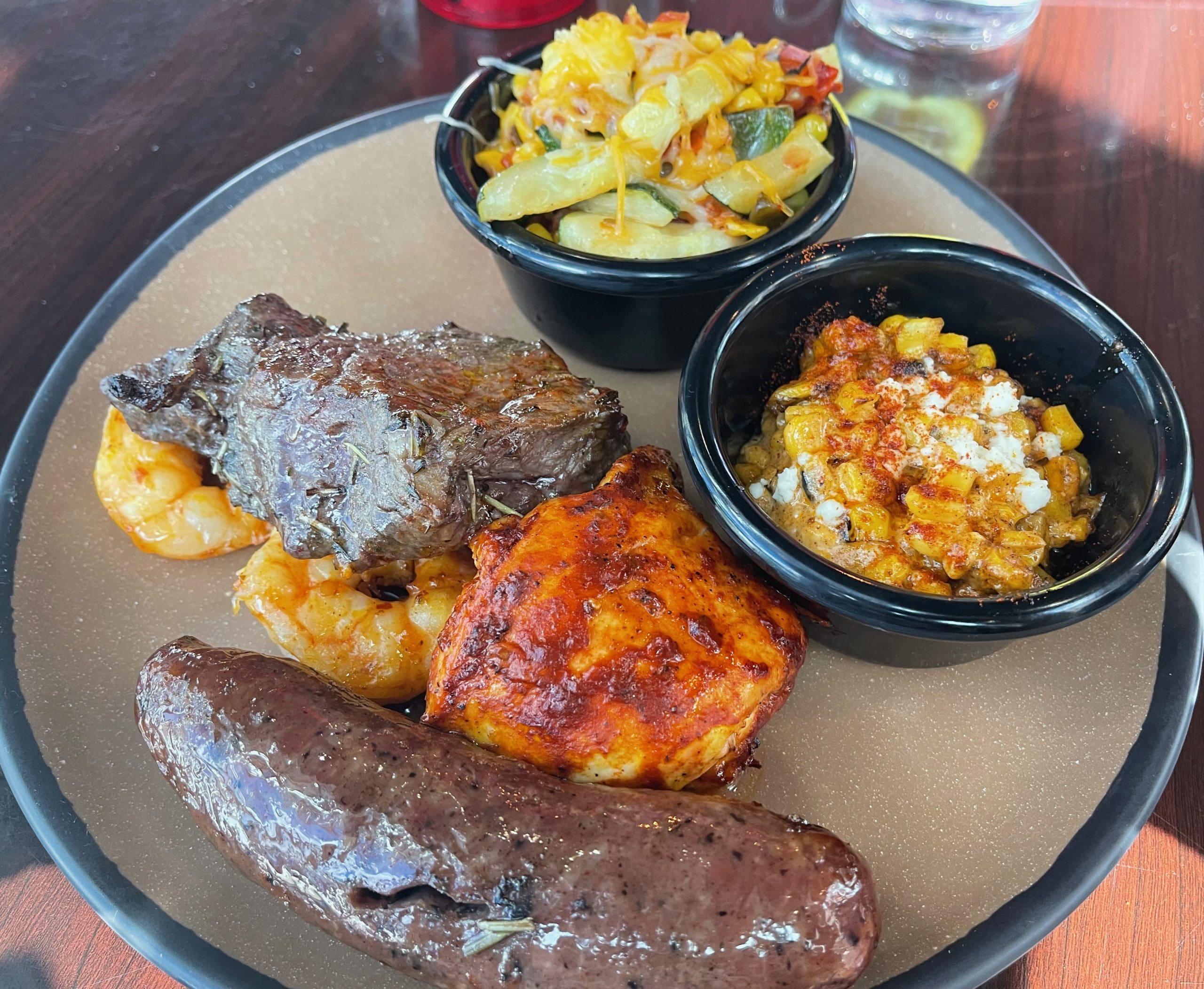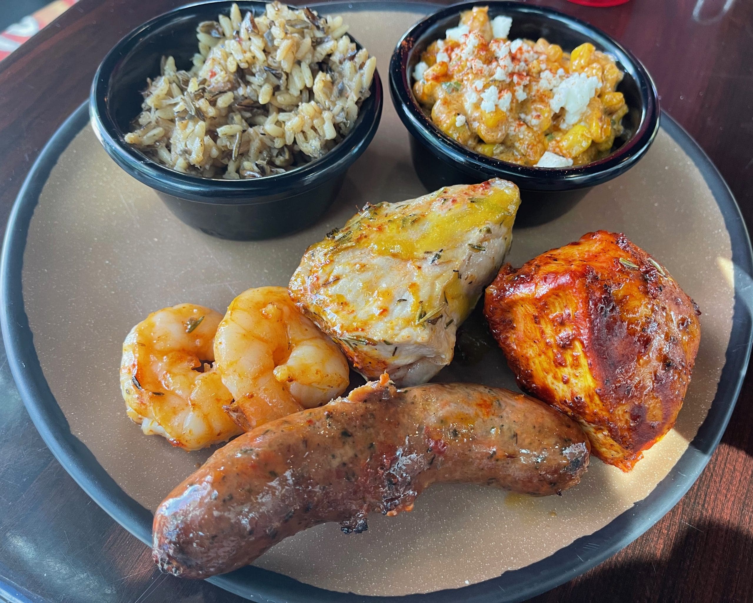 28 August 2022: My Kim surprised me by ordering the rotisserie featuring alligator sausage. Although we lived on the Mississippi Gulf Coast for eight years she never developed a taste for alligator (unlike her husband who could probably eat alligator raw and alive). Also on her plate were achiote chicken breast, pork loin with a jalapeno-mango glaze and Thai sweet chile glazed shrimp. Her two sides were Cajun dirty rice with andouille sausage and elote. While both sides were quite good, the elote (Mexican-style sweet corn with a creamy sauce of fresh lime, chile powder, smoked paprika, cilantro and cotija cheese) stole the show. Only the pork loin and its jalapeno-mango glaze failed to impress. All the meats were moist and juicy. Each had its own personality ameliorated by the chef’s deft seasoning. The alligator, by the way, was so good, my Kim let me have only one bite.