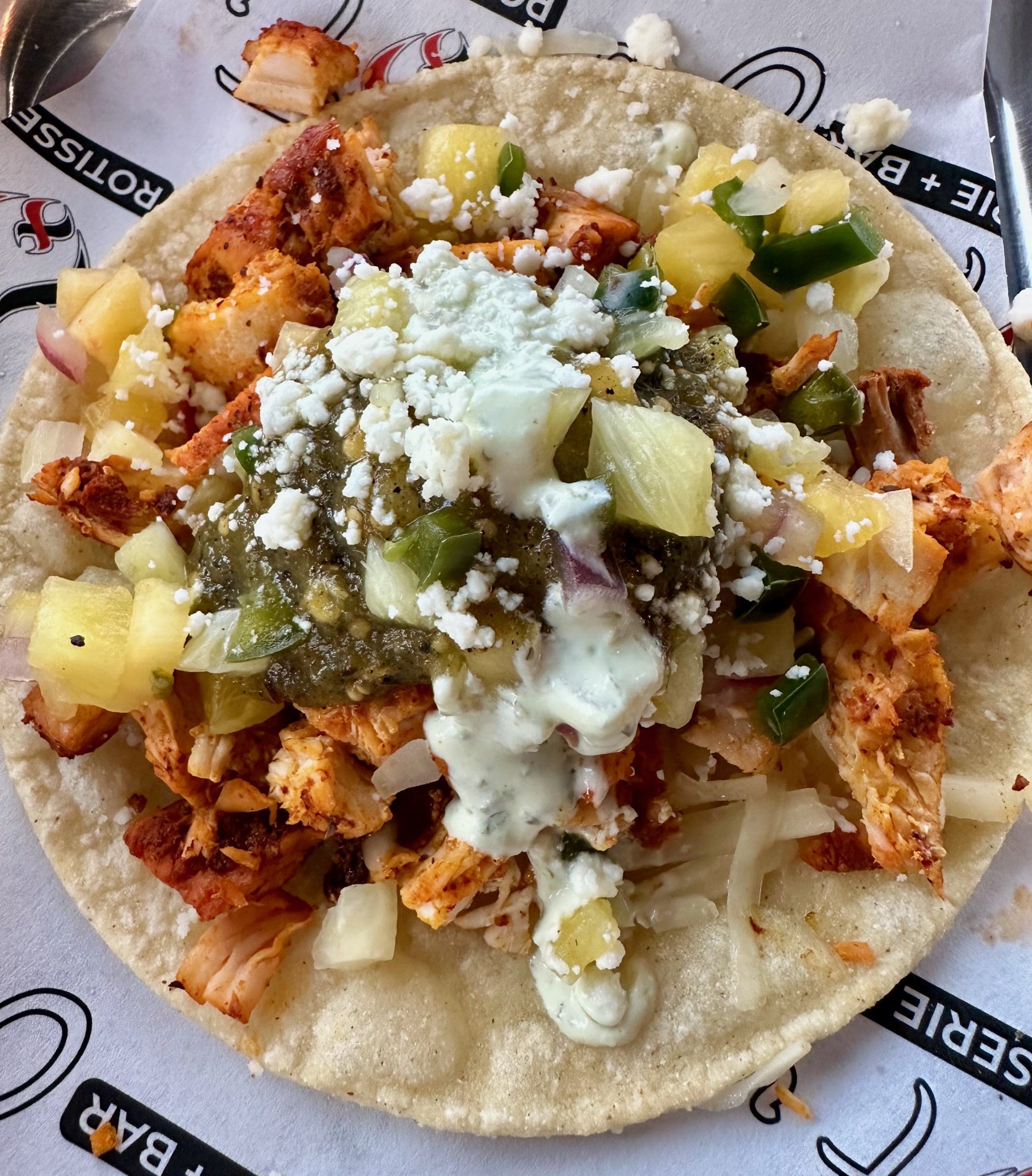 6 March 2024: Eleven tacos festoon the menu, several of which offer special prep options such as no lime crema, no cilantro, no green chile, etc. Tacos are a la carte save for the “chef’s sig tacos” which come three to an order. Taco options include the usual suspects (carne asada, carnitas, chicken, fish) and unique offerings (quesadilla tacos, carne adovada, pork belly). My Kim, who can no longer tolerate anything more piquant than ketchup ordered the rotisserie achiote chicken tacos (rotisserie grilled achiote chicken breast served with pineapple pico de gallo, and queso fresco) sans pico de gallo. The result was something she thought rather boring and dry. The pineapple pico de gallo changes that with a minimum of heat.