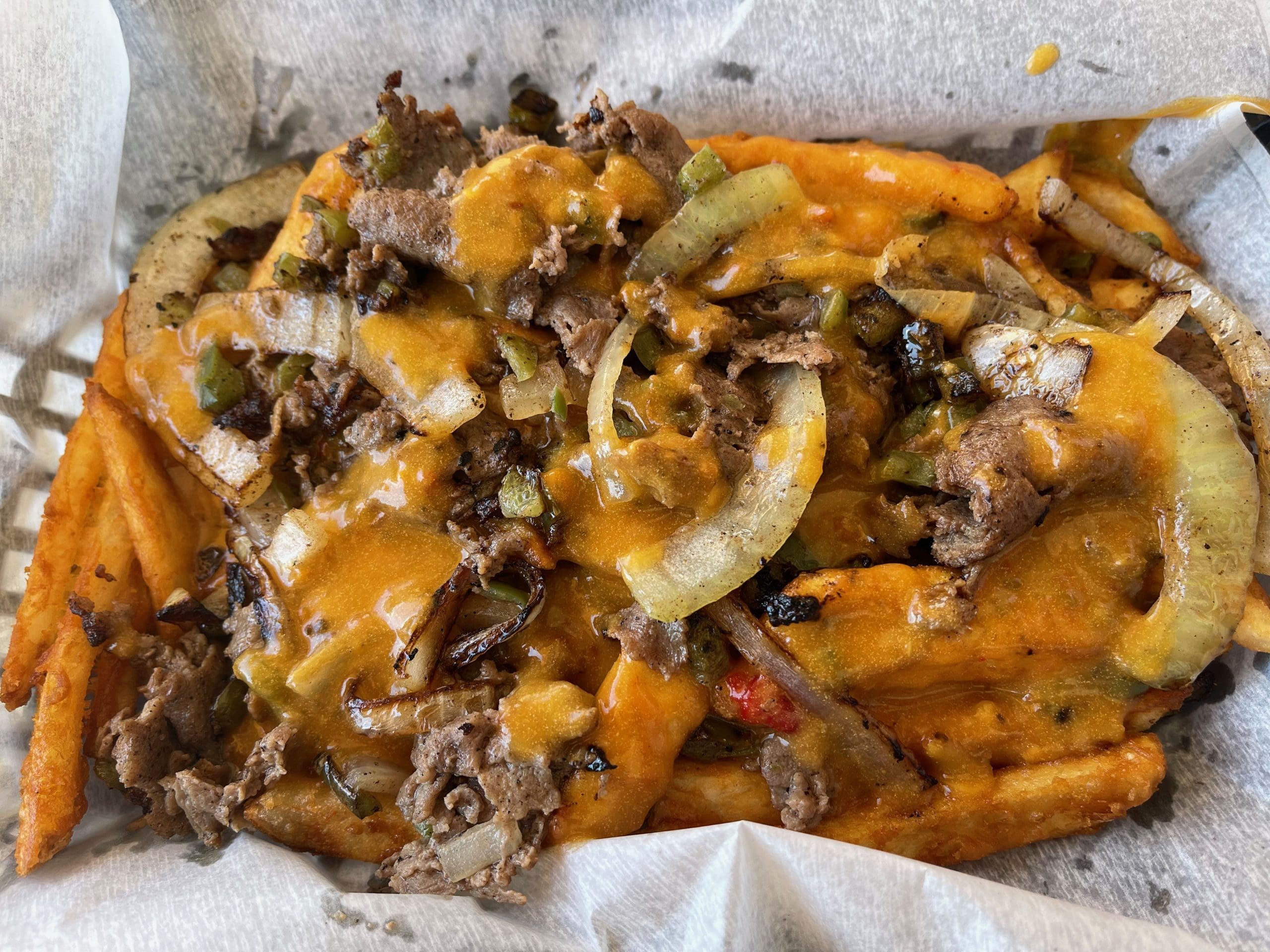 14 September 2022: Our “Chalk Em Up” choice was called Philly fries (Philly steak, queso, onions and peppers over fries), a starter large enough to share. Though filling and good, our druthers next time will be to have the fries sans toppings. These fries are legitimate contenders for honors of their own. They’re crispy on the outside and pillowy soft on the inside. The Philly steak, onions and peppers were also quite good, but the queso diminished the overall quality of this starter. Our experience with Phillies across the Duke City area is that white Cheddar makes the very best cheesy companion to Philly sandwiches…and probably Philly fries, too.