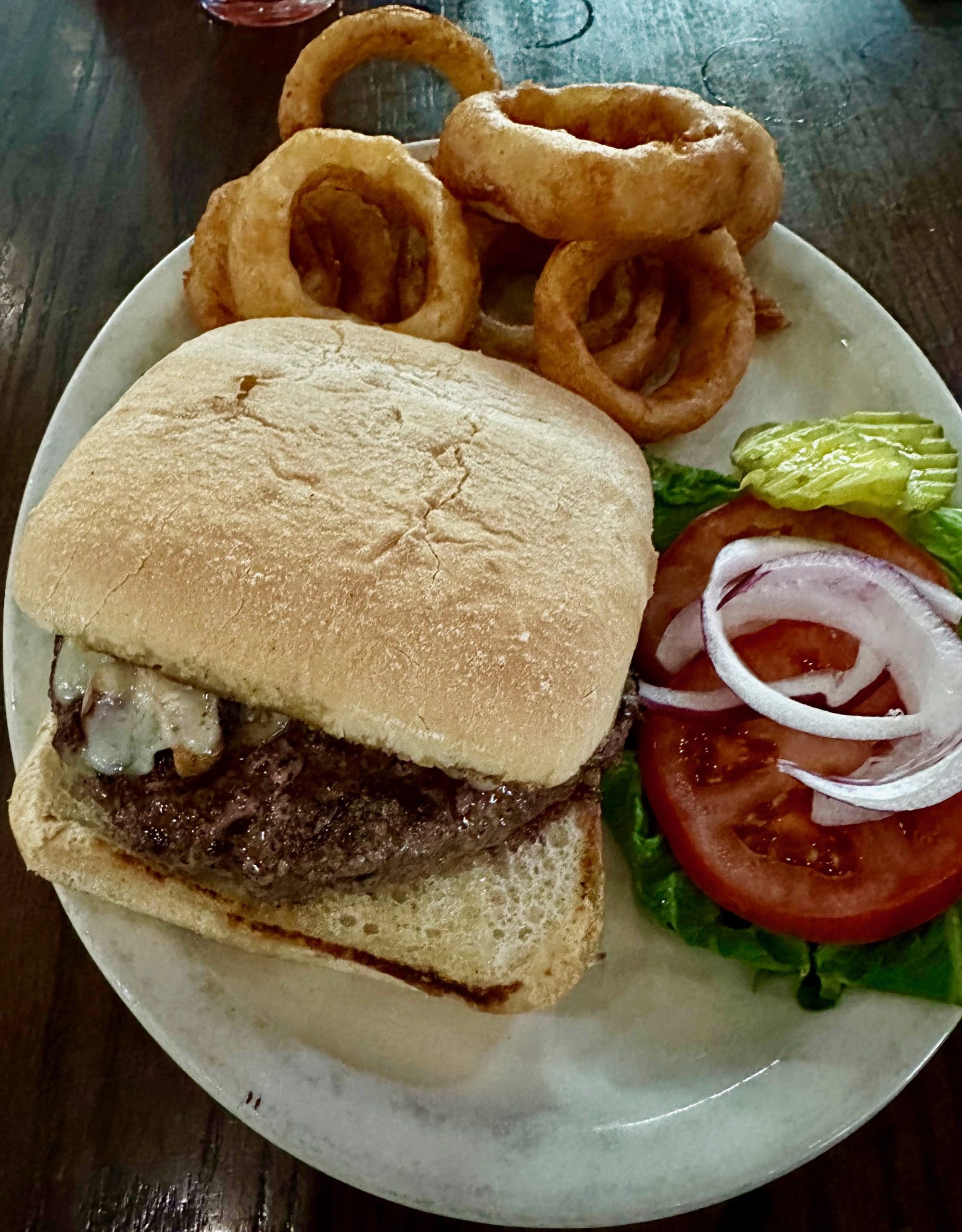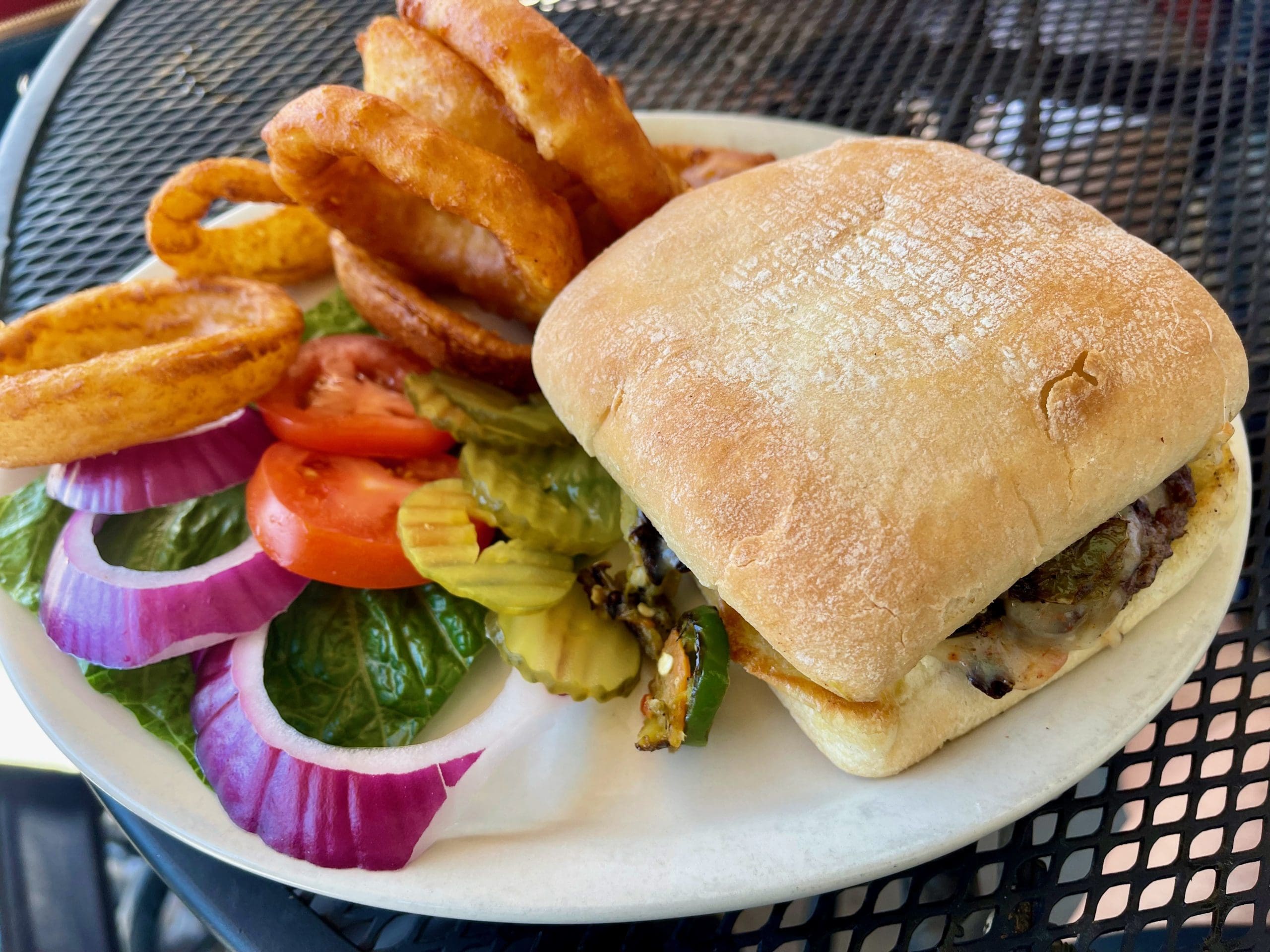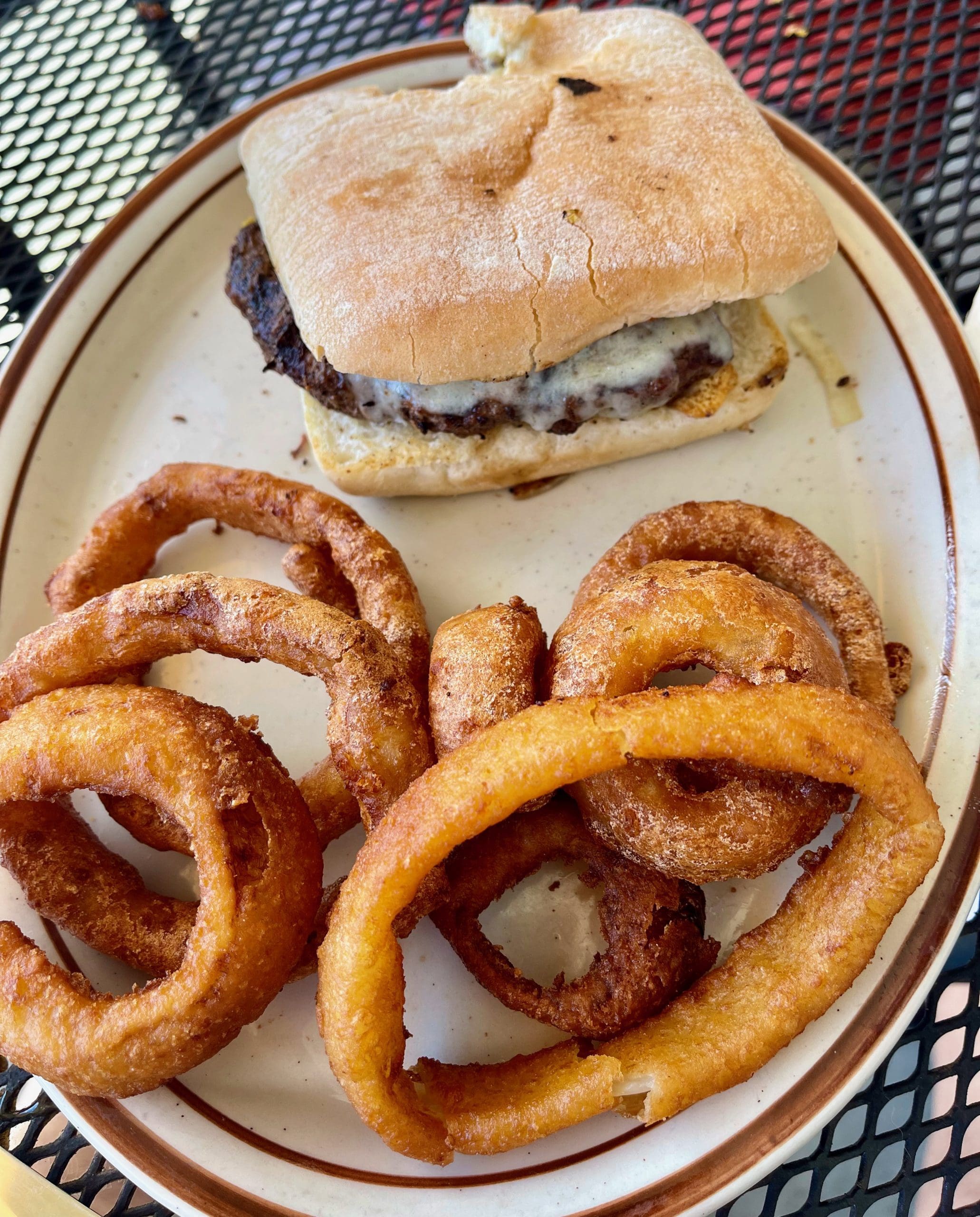 14 September 2022: Seeing how glorious the ciabatta buns on my Spicy Southwest Burger were, my Kim sent back her slightly over-toasted New Mexico Patty Melt (burger patty with green chile and grilled onion on sour dough rye bread) sans green chile and asked that it be redone on ciabatta (again, sans green chile). I wasn’t brave enough to tell her she just exchanged a patty melt for a burger. Thankfully she enjoyed it very much. We both enjoyed the accompanying onion rings, golden-hued orbs with a nice crispy texture giving way to sweet, juicy onions.