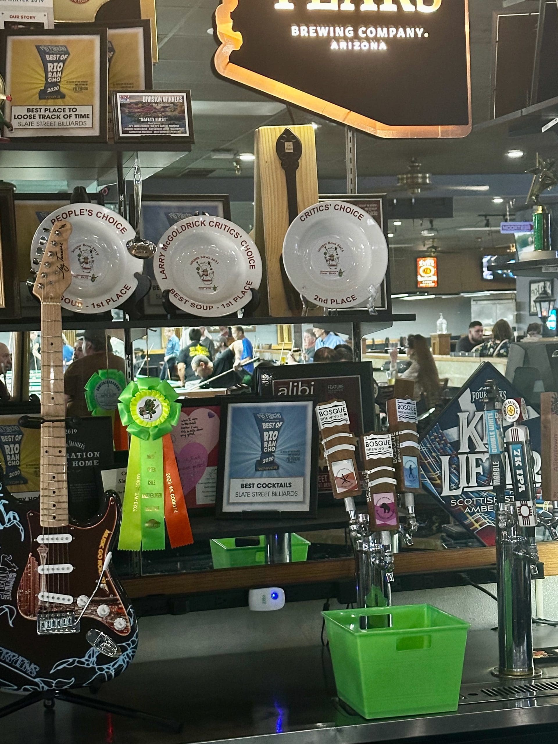 When you stride into Slate Street Billiards you might not notice the awards earned by the bar food. In addition to its first place finish at the Mac and Cheese Festival and the runner-up at the Green Chile Cheeseburger Challenge, Slate Street Billiards has earned three awards at the Roadrunner Food Bank’s annual Souper Bowl. In 2023, it earned the Larry McGoldrick award signifying 1st Place for its Sweet Potato Chorizo Chili. Its first win was in 2019. In 2024, its green chile cheeseburger soup finished second in the judges’ choice competition. Having judged the blind tasting at the Souper Bowl for twelve years, I’m simply blown away by the quality of the food proffered by a “billiards joint.”