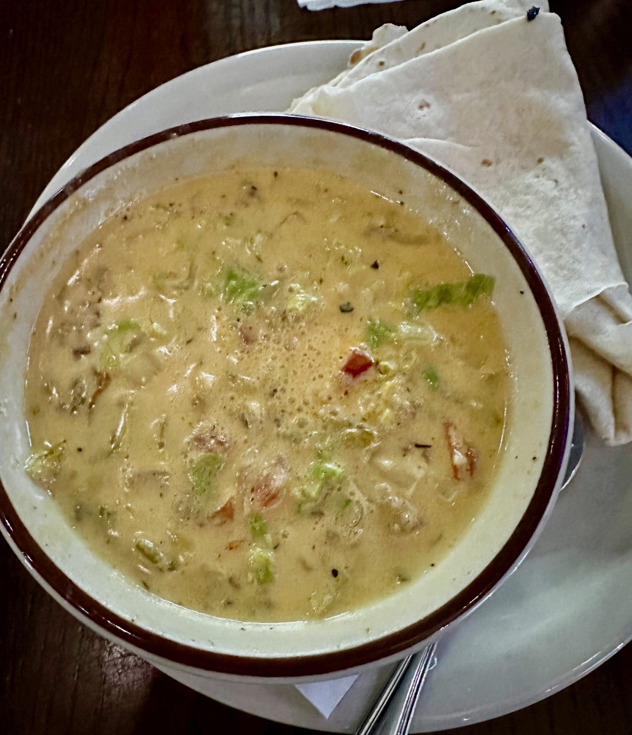 2 March 2024: During the Roadrunner Food Bank’s Souper Bowl event in 2024, there was one soup that blew two of the judges–Glenn Walters (Director of Operations, New Mexico Small Business Development Center Network) and me (humble blogger)–away. That was the green chile cheeseburger soup from Slate Street Billiards. What surprised us most about this enchanting elixir was that it tasted very much like a green chile cheeseburger. A very good one! Its ingredients were those you might find on your favorite green chile cheeseburger: cheese, onion, tomato, green chile…even lettuce. The only ingredient lacking (thankfully) was bread. A plentitude of green chile means a nice New Mexico heat. A flour tortilla accompanies every bowl. You might want to order a quart, gallon or barrel to take home because this magnificent soup is on the soup rotation and doesn’t come around as quickly as you might like. It’s one of the very best soups in New Mexico!